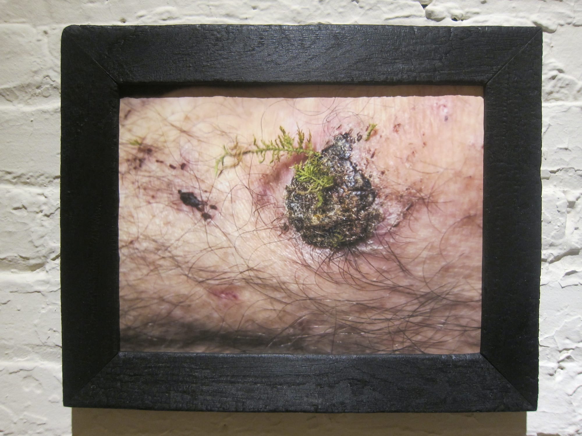 Dunning first came to prominence as a conceptual photographer in the late 1980s. She has long been interested in the human body, inside and out, and more recently in processes of rot and aging as they occur in foodstuffs. She also raises chickens, used to keep bees, gardens assiduously, and for many years has done volunteer ecological restoration work at natural areas in the Chicago region. All of this is pertinent but not absolutely necessary to know. It may be better to start with the very first artwork on view, a close-up photograph of a hairy arm featuring a clumpy dark scab, out of which sprout a few green tendrils of moss.
