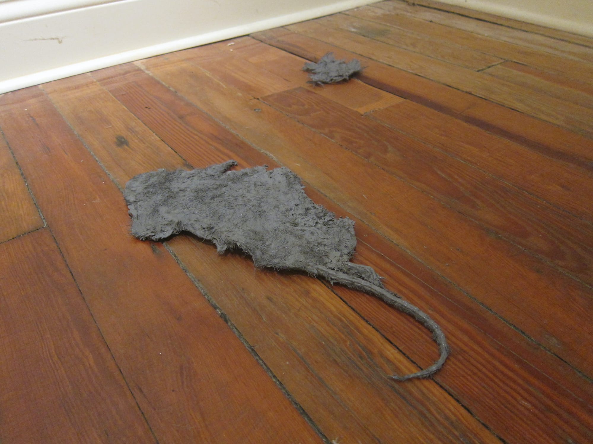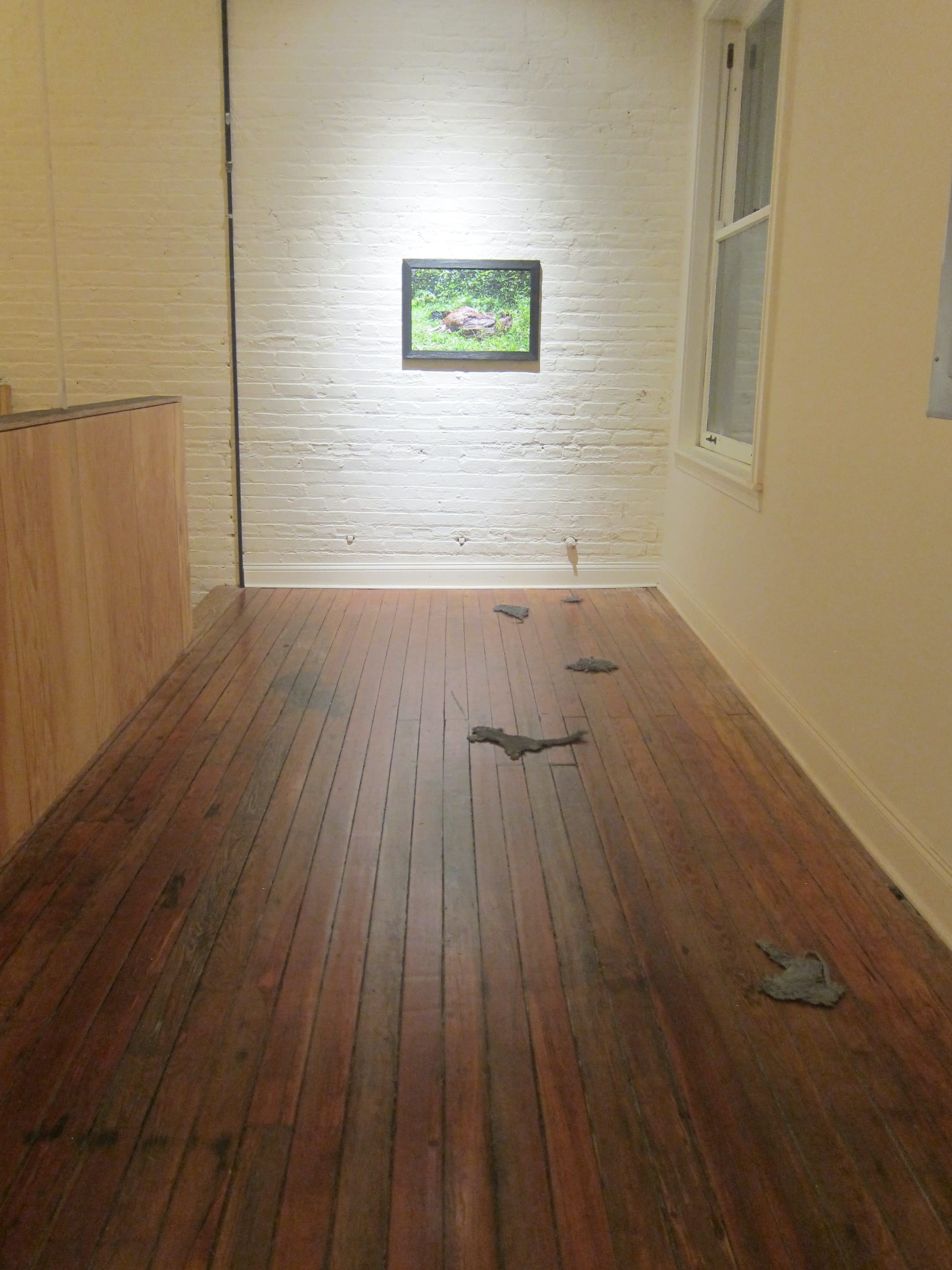 To get from one photo to the other requires crossing a wooden landing bestrewn with seven slight floor sculptures. These are thin, dull-colored, and constructed from the preserved bodies of squirrels, rats, and birds crushed nearly to oblivion. Many more such items are dispersed throughout the rest of the gallery, possibly including mice and rabbits. To make “Found objects (return to when the world was flat),” Dunning carefully collected, dried, and sealed individual pieces of roadkill, painted them a uniform matte gray, and mounted them on aluminum substrates that allow them to hover ever so slightly off the floor. It can be hard to tell what used to be what. Most of the birds just look like piles of feathers, their breasts and heads long gone, though a few have landed in poses that look uncannily like flying. Easiest to identify are the rats, whose tails, it turns out, are extremely durable. One bunny — at least I think it was a bunny — resembles an old-fashioned ladies’ evening glove, dropped and soiled and left behind in the street.