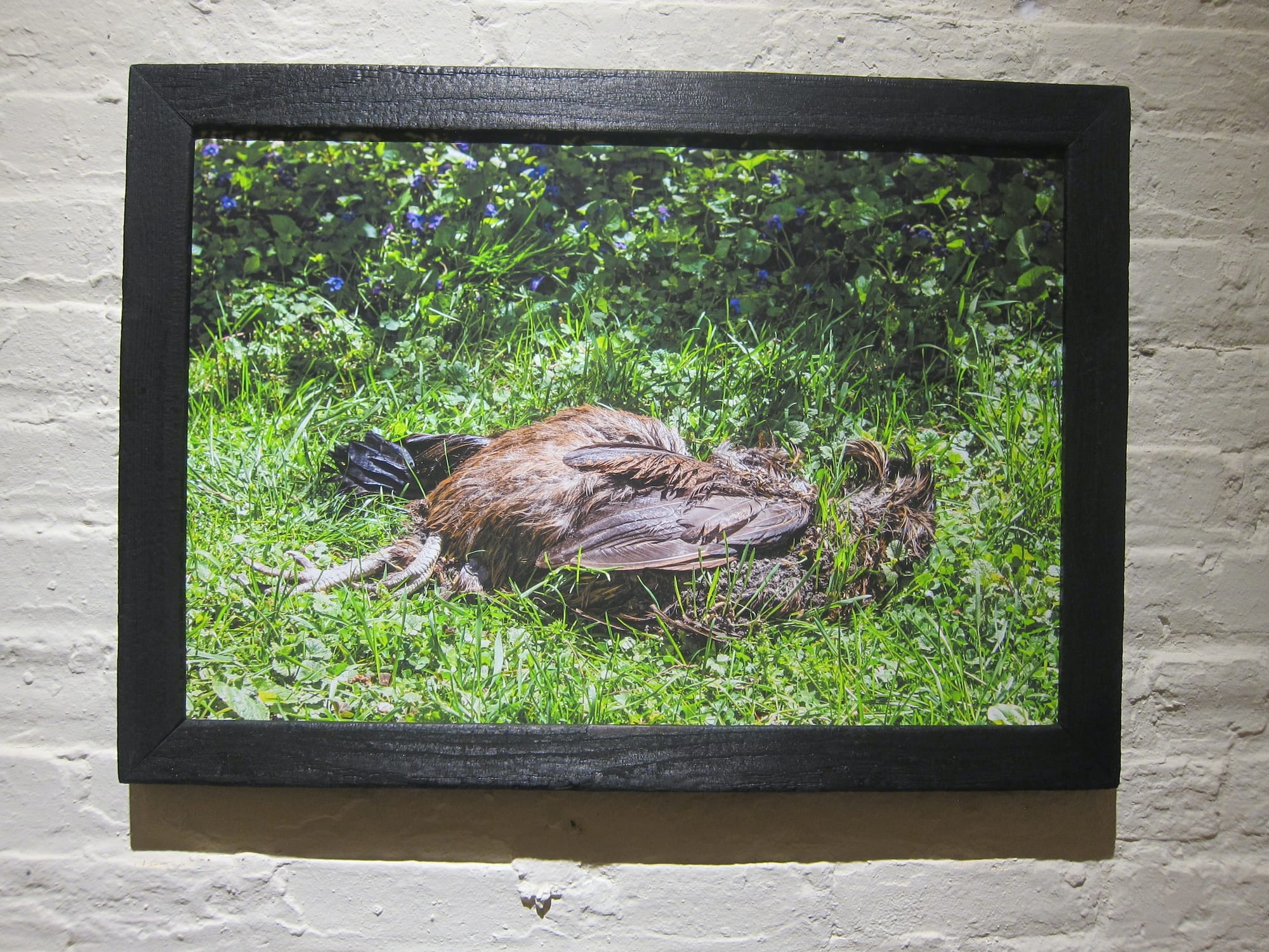 Like so much of Dunning’s work, “A scab” achieves an impossible balance of opposites: gross and beautiful, sick and healthy, strong and delicate. One begins to wonder if these qualities are really so diametrically opposed. In “Watching grass grow,” the photo that hangs on the facing wall, those aspects merge in the form of a dead brown hen, lying prone on a lawn lush with plantain, ground-ivy, clover, violets, and a shimmery emerald beetle. Her back feathers gleam in the sun. The front ones are badly mangled, and close looking reveals thick shoots of verdant grass growing right out of her remains. The picture is at once breathtakingly full of vigor and unbearably sad, not despite but because of its commingling of life and death.