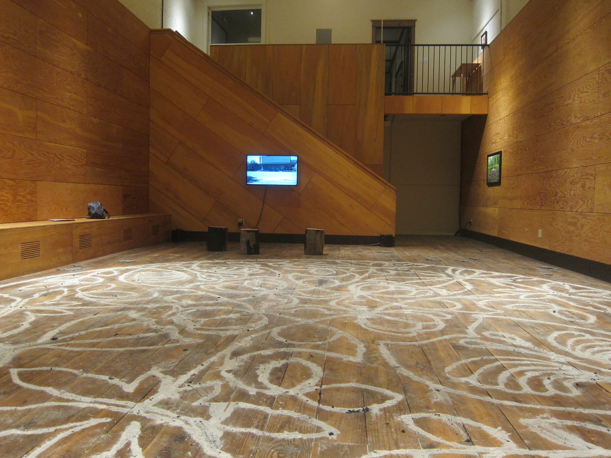 Now there is Jeanne Dunning’s solo exhibition at Watershed Art & Ecology, a newish space founded by artist Claire Pentecost and writer-cartographer Brian Holmes in the former Narodni Tel Klub, a Bohemian/Czech men’s club built in 1906 to provide social space for the city’s growing Eastern European middle class. (Full disclosure: Dunning is my husband’s colleague at Northwestern University; Pentecost is mine at the School of the Art Institute of Chicago. That’s how it often goes in Chicago.) The gallery is located in what was originally the building’s gymnasium, and it is currently filled with more than two dozen gray sculptures made from flattened roadkill, an immense, nearly impassable floor mandala composed of silvery ash, a trio of saturated color photographs, and a pair of videos, one shot in the woods and the other in vacant urban spaces.