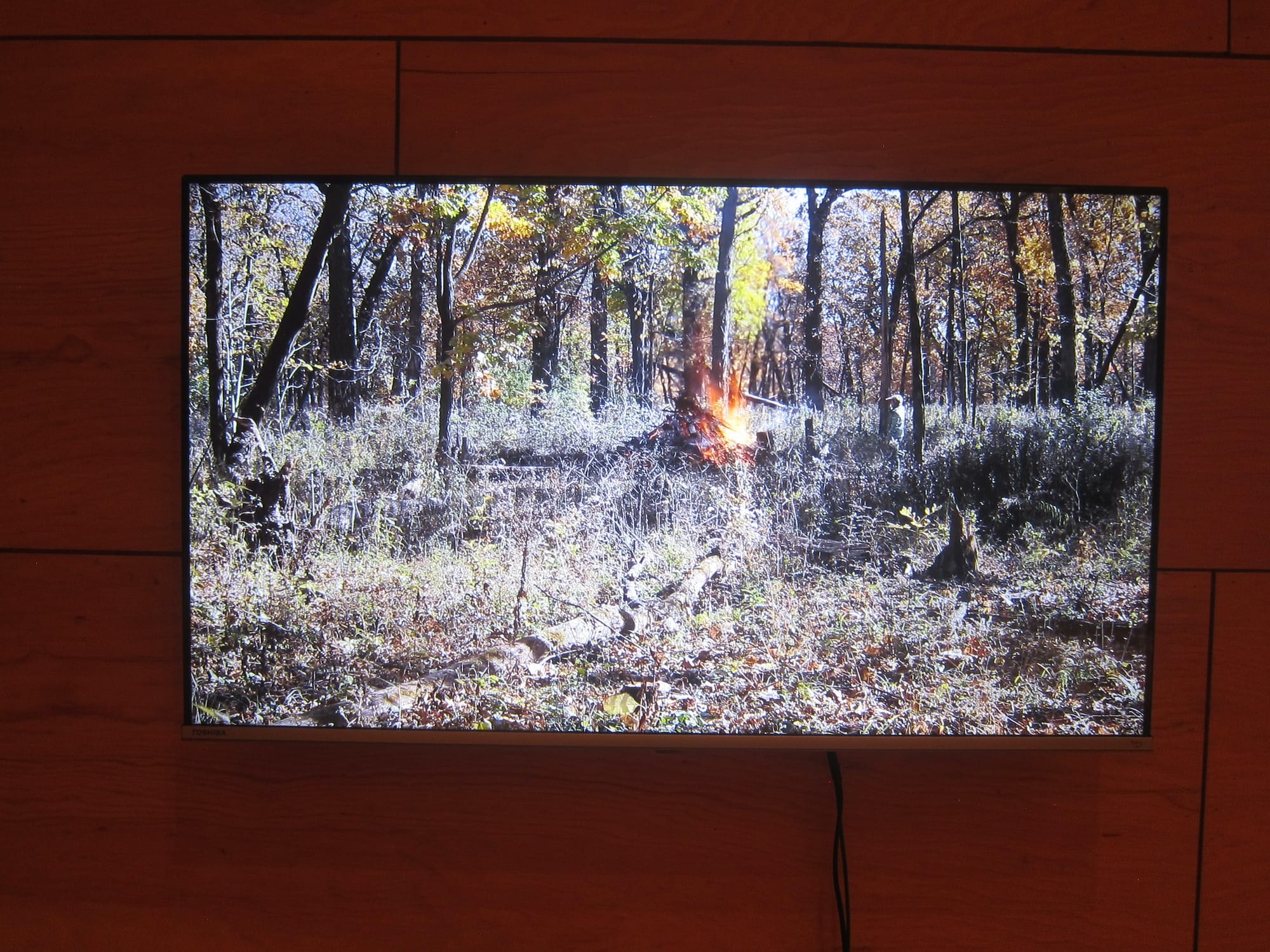 How to care? Making merciless, sincere art about the most intractable problems is one way. Another is by means of fire, present here in wooden photo frames, charred to a glossy black; a half-dozen tree trunk stools, singed, that serve as gallery seating; the mandala, traced from the ash residue of monthly blazes in which Dunning burned effigies of herself; and the forest video, which records a year of her rituals. What does fire have to do with care? The stools were scorched in a controlled burn, where dead leaves and grasses are burned off a large area, mimicking naturally occurring fires; the effigy pyres were piles of invasive brush, incinerated as part of forest management and prairie restoration practices. That which looks like destruction can be necessary for amelioration, for the continuance of life, no matter how painful or grotesque the process. Burn it to the ground, bend down to pick up the dead bodies — somehow, Jeanne Dunning has been brave and determined enough to make amends.