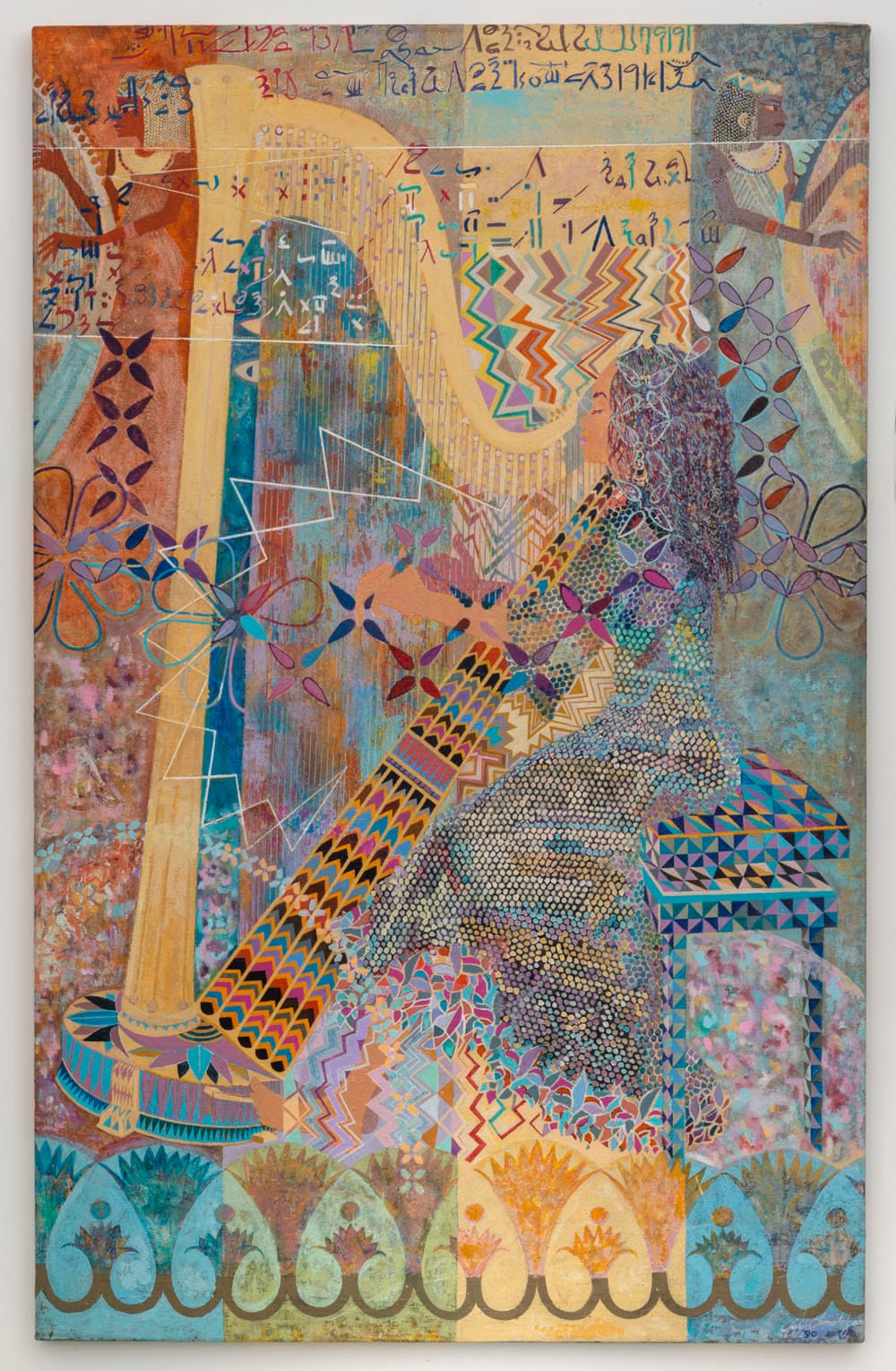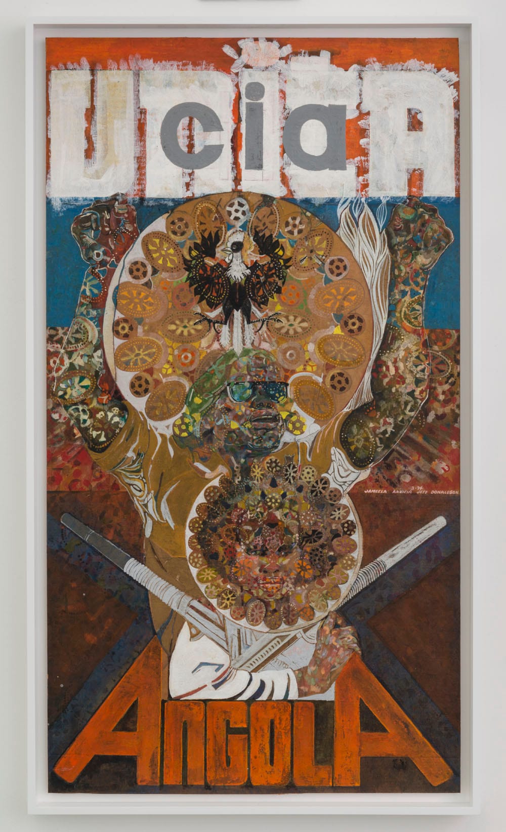 Donaldson’s combinations of figures, words, Christian symbols, Ancient Egyptian symbols such as the ankh (the sign for life) and hieroglyphics, Afro hairdos, and decorative and psychedelic patterns made from paint, metallic foil, and newspaper photographs anticipates the Pattern and Decoration movement as well as the work of artists as different as Chris Ofili and Mickalene Thomas. Given his forward-looking artwork and dedication to developing an alternative Black iconography, it is both shocking and unsurprising that he never exhibited in New York in his lifetime. His body of work and political activism underscores the multiplicity of narratives running through recent art history, and that the one focusing on the rise of Minimalism and Pop Art tells only part of the tale.