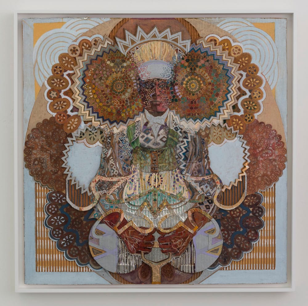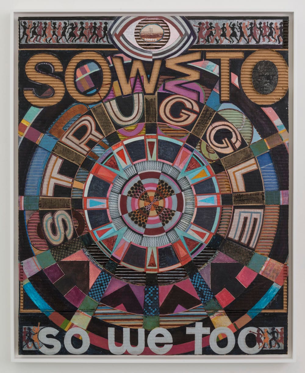 The words “So We Too” run along the bottom of the piece, a pun through which Donaldson conveys his view that the Black struggle for freedom and equal rights is worldwide, and that there is a bond between African Americans and the Black South Africans living under apartheid. The use of corrugated cardboard imbues the work with an urban grittiness as it recalls the sheets of corrugated steel used to build the poverty-stricken shanty towns ringing cities like Johannesburg and Cape Town: he has transformed cheap packaging material into an art that is simultaneously political and decorative.