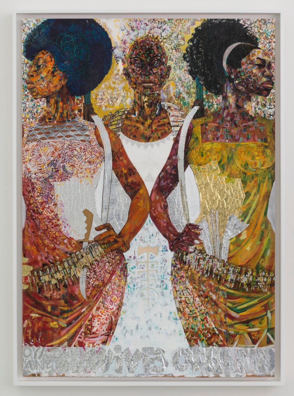 In the earliest work in the exhibition, “Wives of Sango” (1969) (it is often spelled “Shango”), Donaldson depicts the Yoruba god of lightning’s three wives (Oshun, Oba, and Oya) in modern dress. The middle is facing frontally, while the ones on either side turn toward the painting’s edges. They are wearing bandoliers, with rifles slung over their shoulders. The artist has affixed sections of gold and silver foil to the dresses of the women on the left and right, meticulously patterning their clothes and skin without overwhelming their features or body. The reference to a Yoruba god’s wives is meant to instill pride and a feeling of nobility in the viewer, the sense that Black people living in America were descendants of majestic warriors.