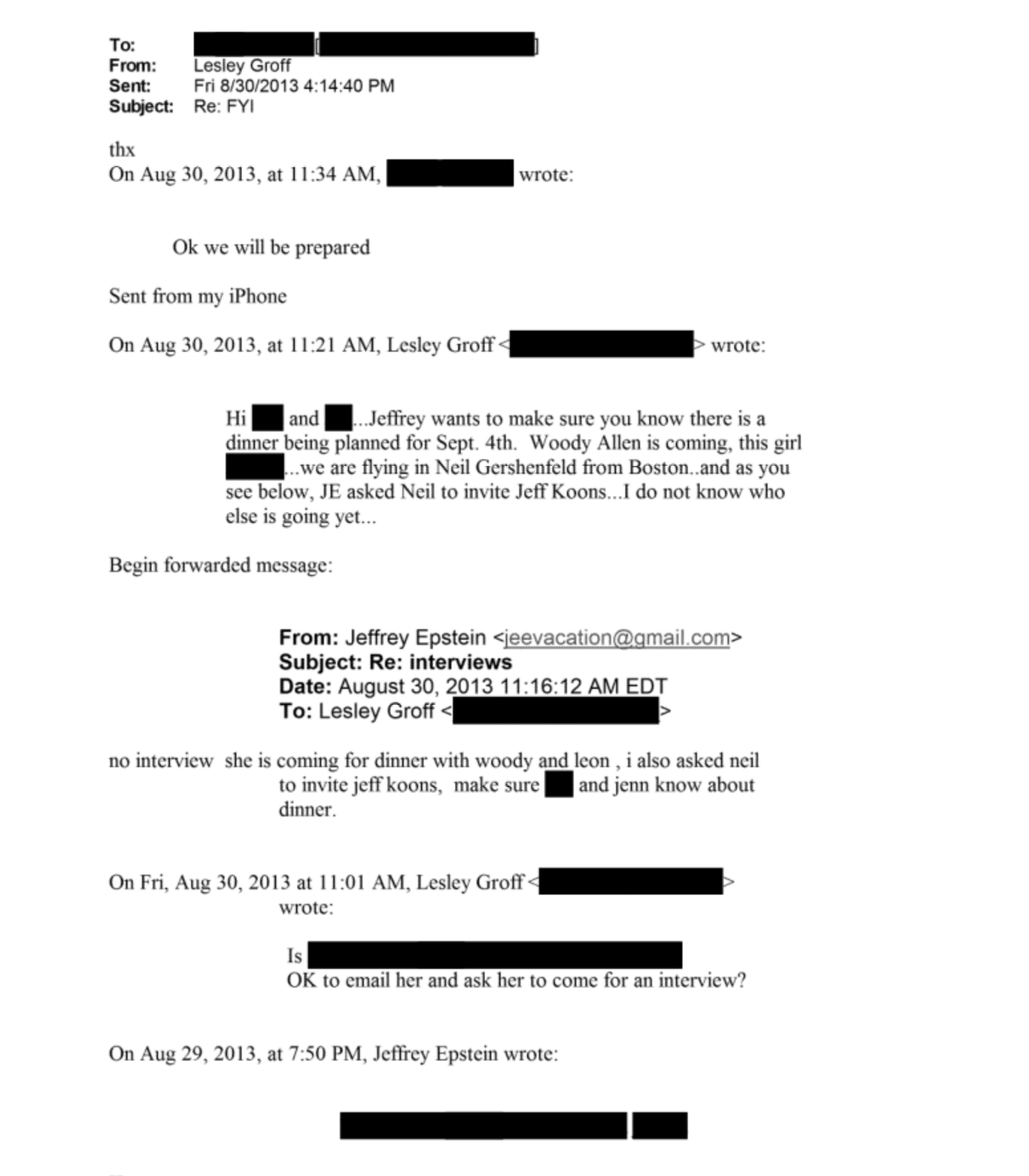 "Jeffrey wants to make sure you know there is a dinner being planned for Sept. 4th," Groff wrote in the email, sent on August 30, 2013. "Woody Allen is coming, this girl [redacted]...we are flying in Neil Gershenfeld from Boston..and as you see below, JE asked Neil to invite Jeff Koons... I do not know who else is going yet..."