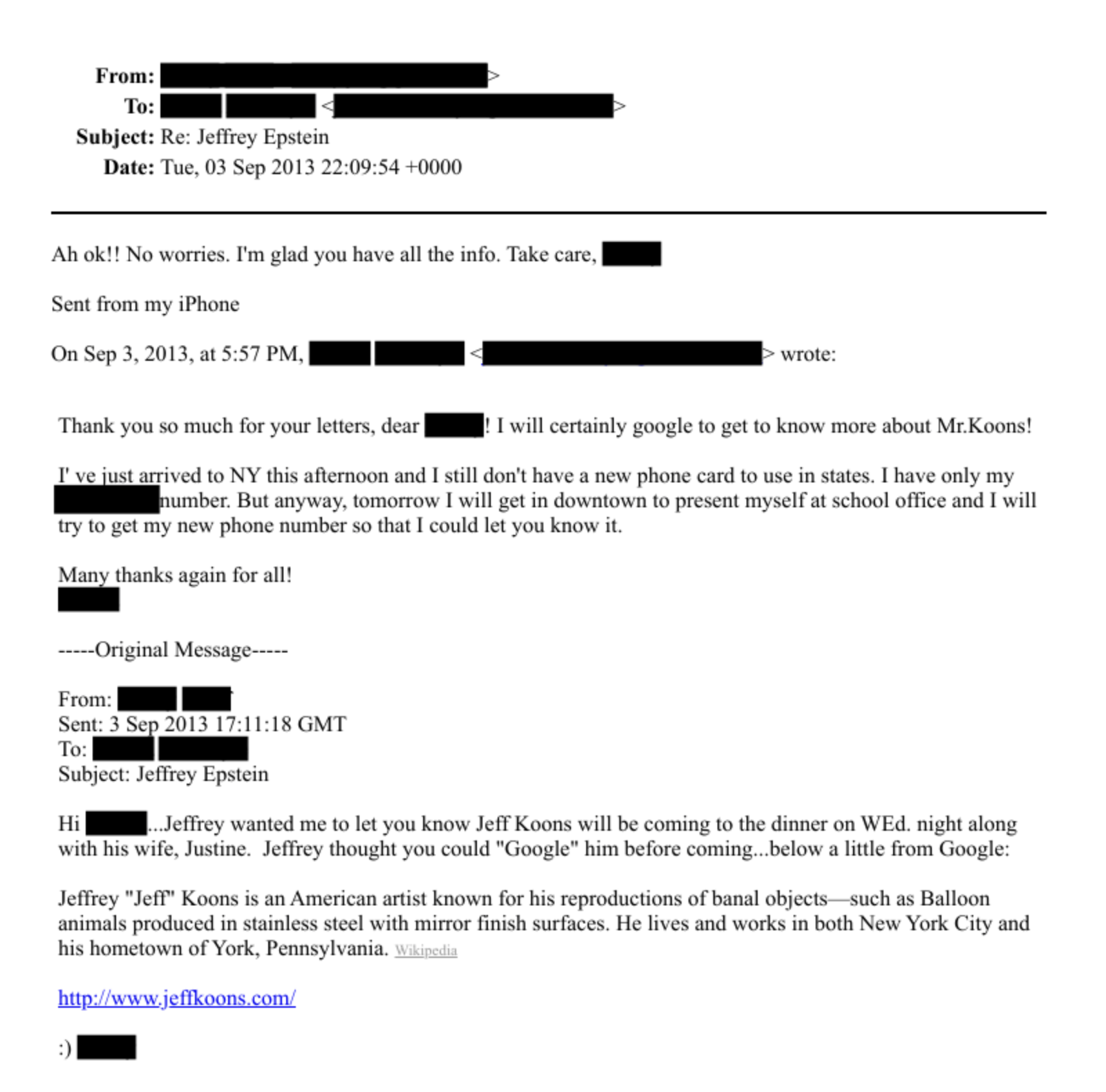 On September 3, a day before the dinner, an individual apparently working for Epstein told a recipient whose name is redacted to learn more about Koons ahead of the party.