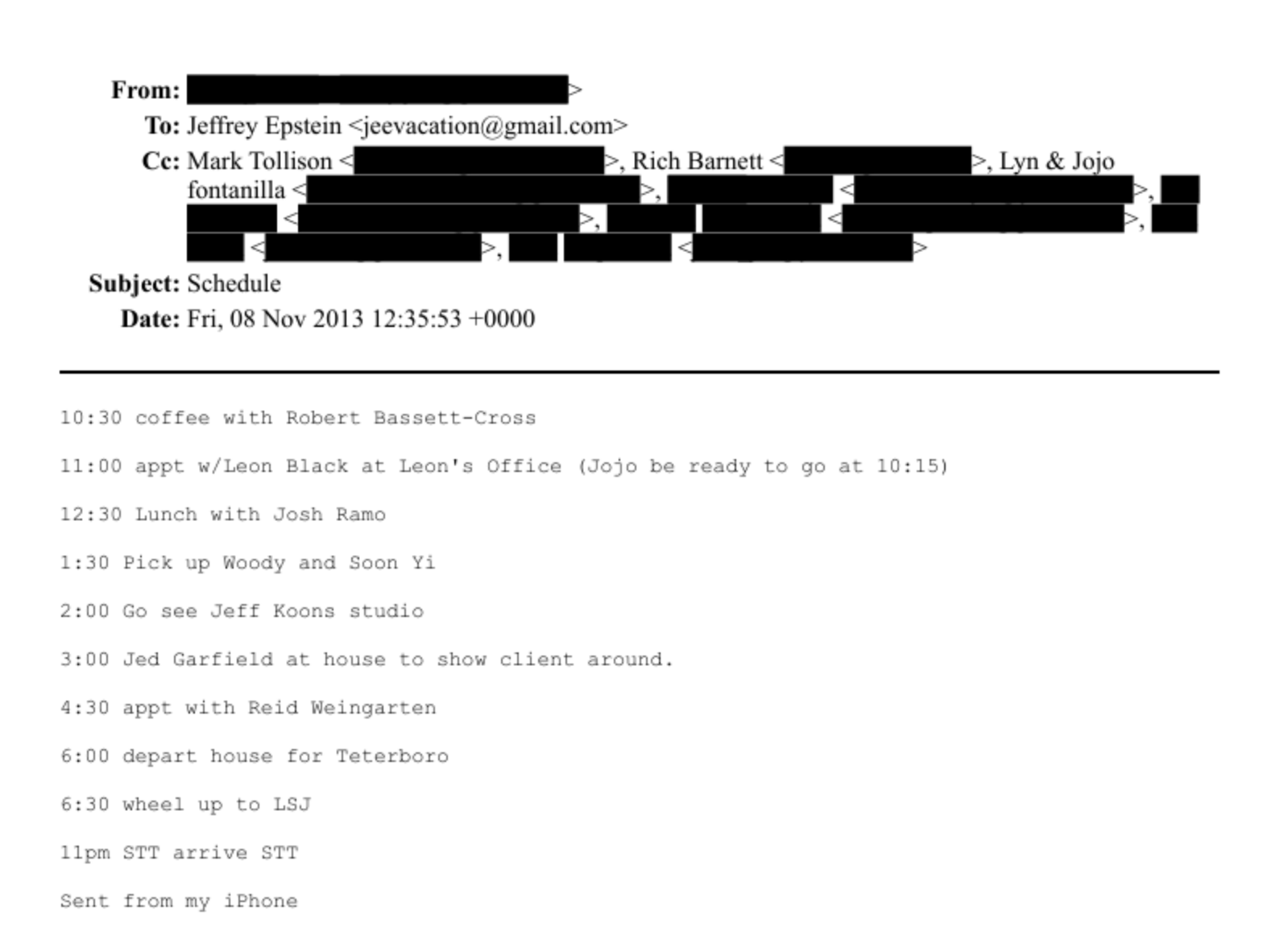 However, an email apparently containing Epstein’s November 8 schedule, sent that same morning, referenced a plan to "go see Jeff Koons studio" at 2 pm. Another message Epstein received a year later from a redacted contact references a visit to Koons’s studio: “Rudy Ovchinnikova is back in town! Going to her bday tonight! Remember she came with us to Jeff Koons studio?”