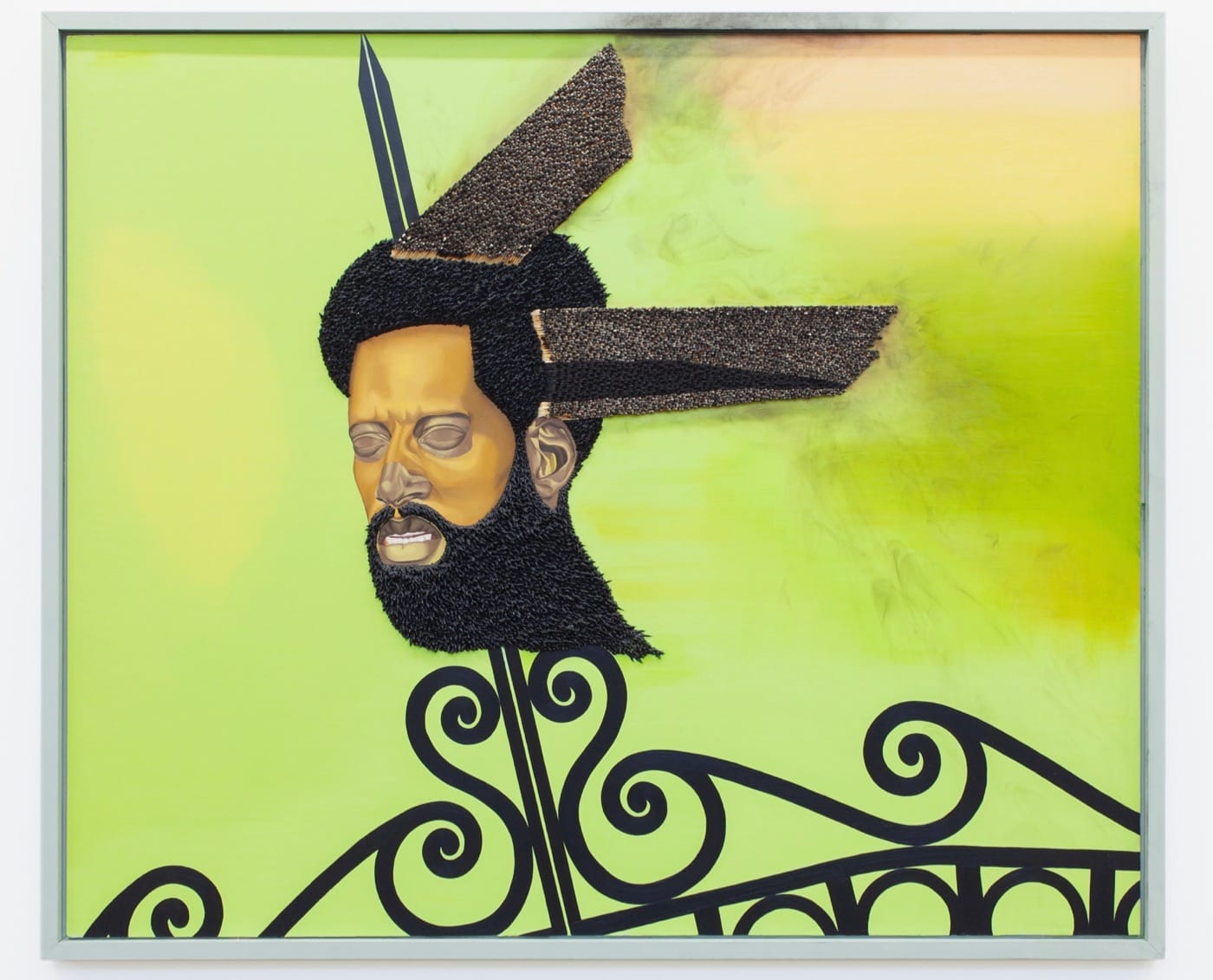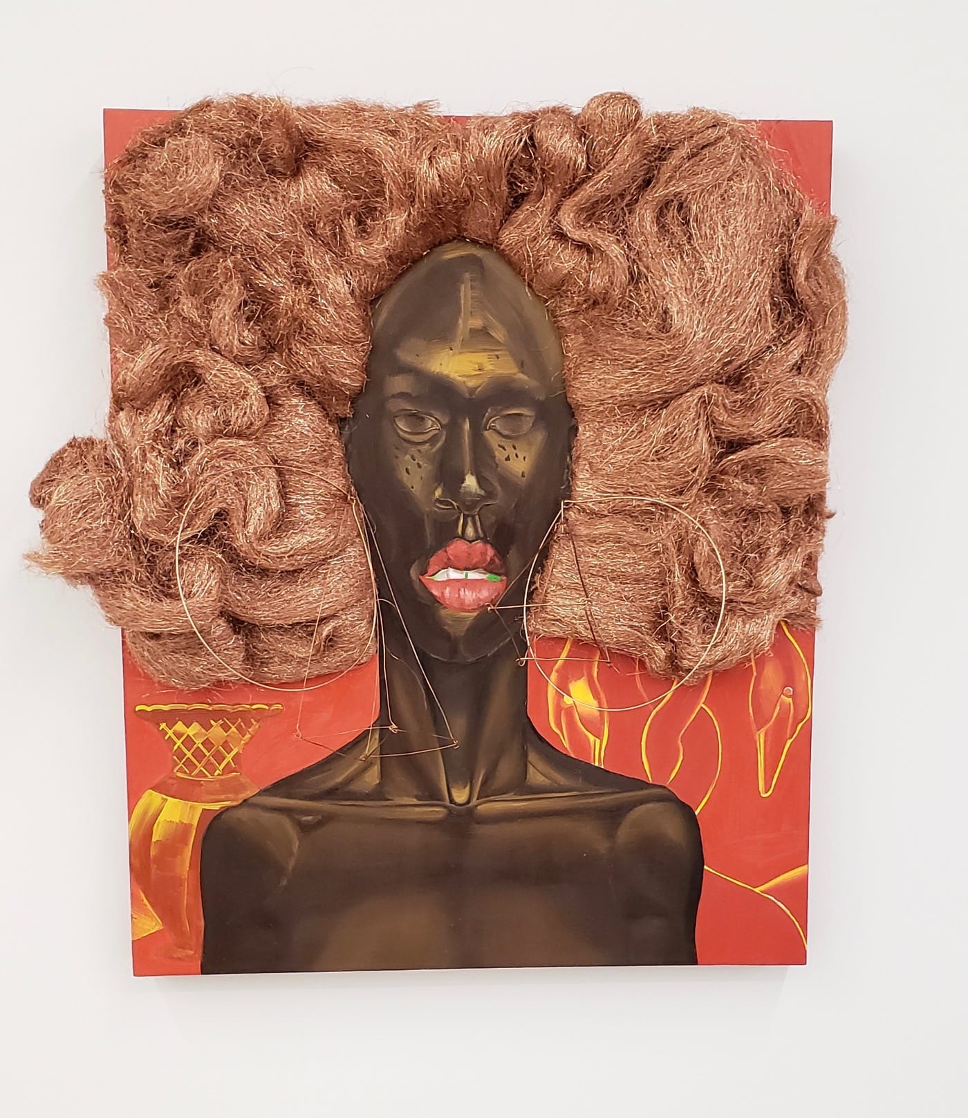 Viewers can lose themselves in the other deft manipulation of materials in his work. For example there is the copper wool that becomes a thicket of red hair in “Conductor” (2018), with wire bent into large hoops and pyramids hanging from the figure’s ears to remind me of the “door knocker” earrings worn by women around the way where I grew up in the Bronx. In Sonhouse’s “Resuscitation of a Golden Era Blues” (2018) the two boards replete with burnt matches radiate out from the figure’s head-like wings — thus although that head is impaled on a spike, it seems like it’s flying, perhaps through his own historical narrative, a trail of smoke behind him.