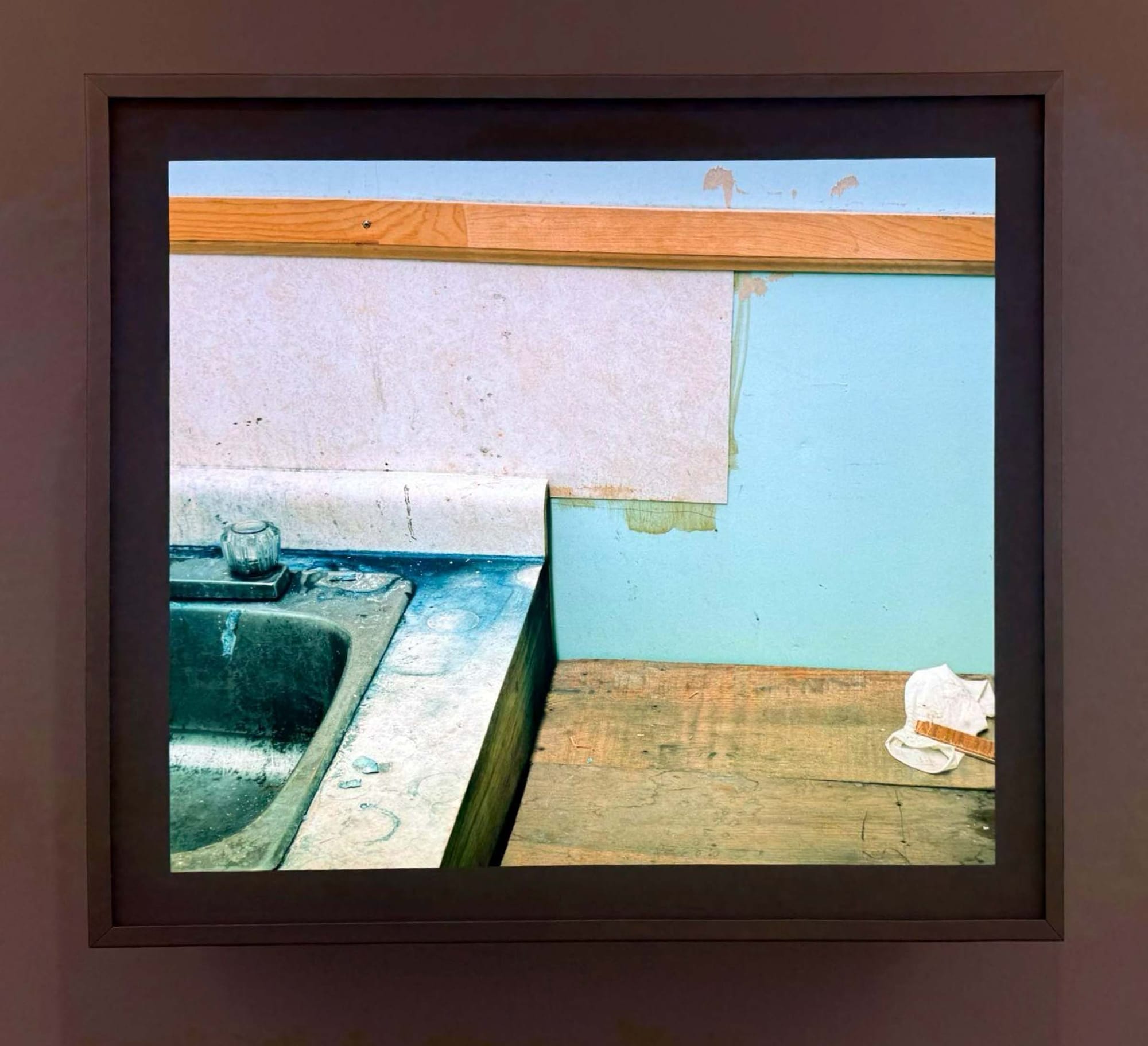 That’s not to say that the exhibition doesn’t indulge in spectacle; it certainly prioritizes Wall's large lightbox transparencies and life-size prints. But quieter, smaller pieces generate their own pull. Backlit transparencies like “The Pine on the Corner” (1990) glow with alluring intensity and personal familiarity, like a memory. And Wall's formative interest in painting comes through strongly in works such as "Diagonal Composition" (1993), a slanted image of a dirty studio sink, tiled backsplash, and piece of soap that reveals his concern for color, composition, and the inner workings of image-making.