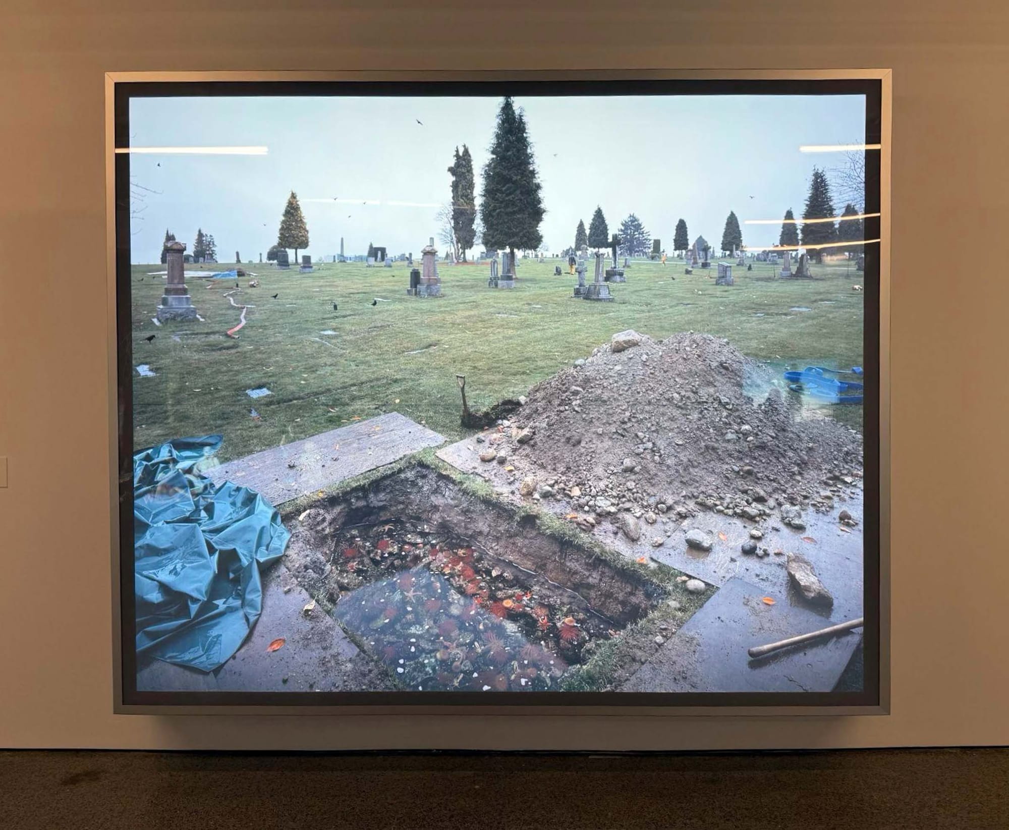 Consider “The Flooded Grave” (1998–2000), where digital editing transforms a desolate burial site into an impossible vision: ocean water filling the grave's ready hollow, flecked with starfish, a beguiling image pulled from the artist's dreams. Or “Dead Troops Talk (a vision after an ambush of a Red Army Patrol, near Moqor, Afghanistan, winter 1986)” (1992), where fallen soldiers lie across a gnarled battlefield, appearing to converse openly after death. Most of the media we consume today charges ever-forward — film or TV, short-form video, the endless scroll — but Wall's photographs hold us in place, suspending disbelief to encourage all kinds of imaginative leaps.