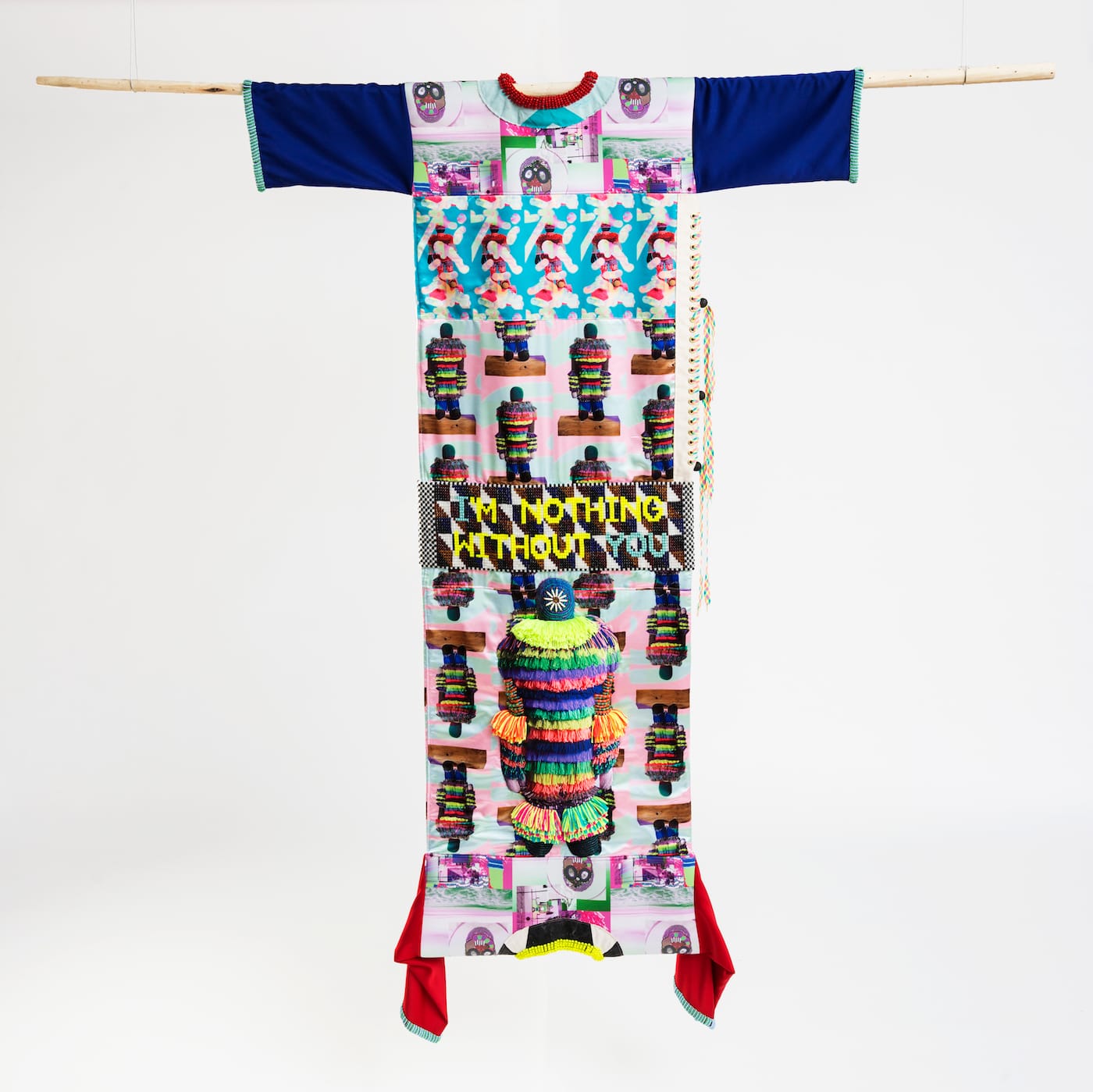 Before we finished our conversation, I asked Gibson again about the text written in beads on the front garment. “It’s from the 1990 Sandra Bernhard film, Without You I’m Nothing,” he said lightly. “Have you seen it? It’s hilarious.”