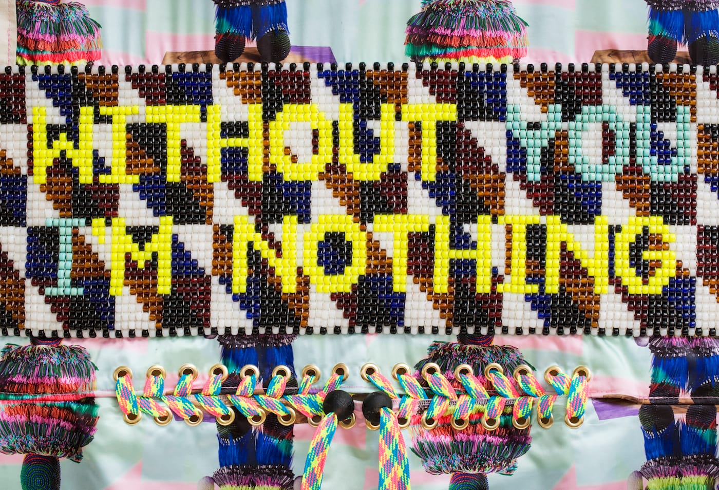 Four monumental garments hang from the ceiling over the entrance to the 2018 Armory Show. “WITHOUT YOU I’M NOTHING,” which is also the title of the installation, is written in beads across the midsection of the garment in front. I asked Jeffrey Gibson, the artist who made the garments, whether the text refers to the idea that fashion waits to be animated by people — that without us, clothes are nothing.