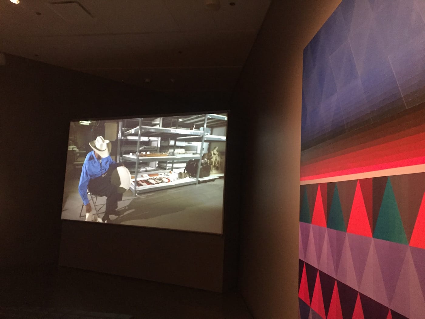 The first work Gibson conceived for Like a Hammer was the film “Video: one becomes the other” (2014–2018). The film is set in the Native American archives and art storage of the Denver Art Museum. We see a man speaking Kiowa pick up a hand drum from a shelf and begin to play. A woman in a long, white dress with colorful patterns enters the halls, dancing in time. There is an improvised moment where an art handler asks to participate in the filming. He opens a drawer, and finds a Navajo weaving comb like his grandmother’s. He talks to the comb as if it is his deceased grandmother, bringing himself to tears. The sleeping objects are understood as living.