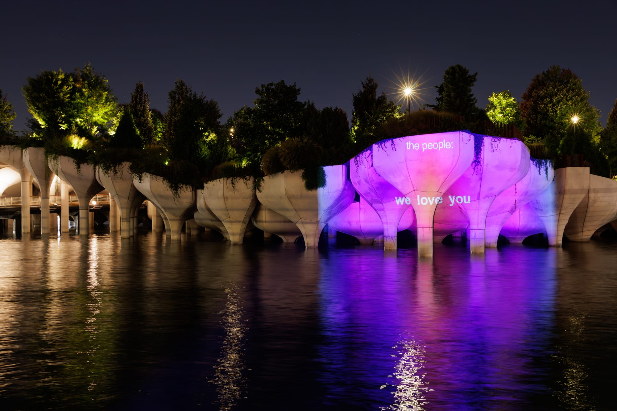 “The Spirits Are Laughing” (2024) will also travel to the Ford Foundation Center for Social Justice, Emerson Collective's headquarters, and Grand Army Plaza. Meanwhile, audiences will be able to find nightly displays at Manhattan Bridge Anchorage, on Pearl Street, and the BQE Wall in Dr. Susan Smith McKinney Steward Park. All projections run from dusk at 7:30pm to 10pm.