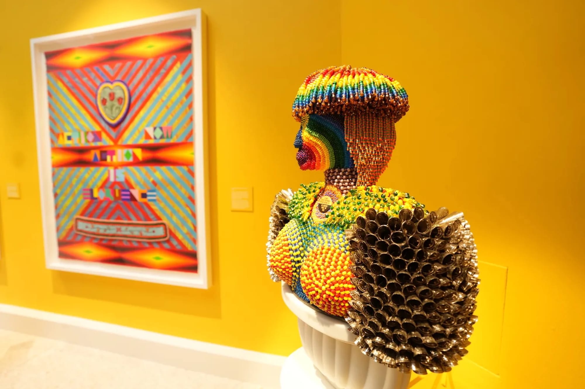 A member of the Mississippi Band of Choctaw Indians with Cherokee ancestral roots, Gibson also heavily featured his signature beading practice into works at the US pavilion, incorporating jingles and other material references to a variety of Native cultures and aesthetics across Turtle Island. Across mediums, Gibson engages in subversive Indigenous survivance entwined with queer symbolism by recontextualizing archival documents of oppression and liberation.