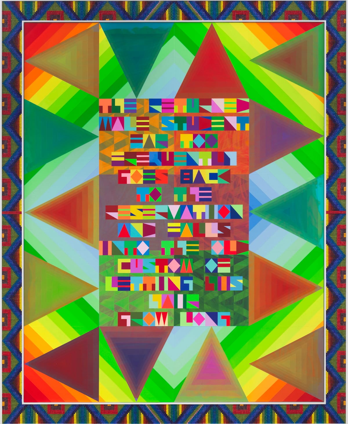 Opening on May 10 and running through September 28, the Broad's curation of the space in which to place me (2024) will showcase over 30 artworks by Gibson that debuted at the pavilion throughout the first-floor galleries. The presentation will also include the museum's new acquisition, Gibson's painting "THE RETURNED MALE STUDENT FAR TOO FREQUENTLY GOES BACK TO THE RESERVATION AND FALLS INTO THE OLD CUSTOM OF LETTING HIS HAIR GROW LONG" (2024). In it, the artist deployed his telltale colorful geometric patterning and stylized text to incorporate a direct quote from a 1902 letter by the Commissioner of Indian Affairs to a superintendent of the Round Valley Indian Reservation in California, urging them to order Native children to cut their hair and assimilate to White western attire and appearance.