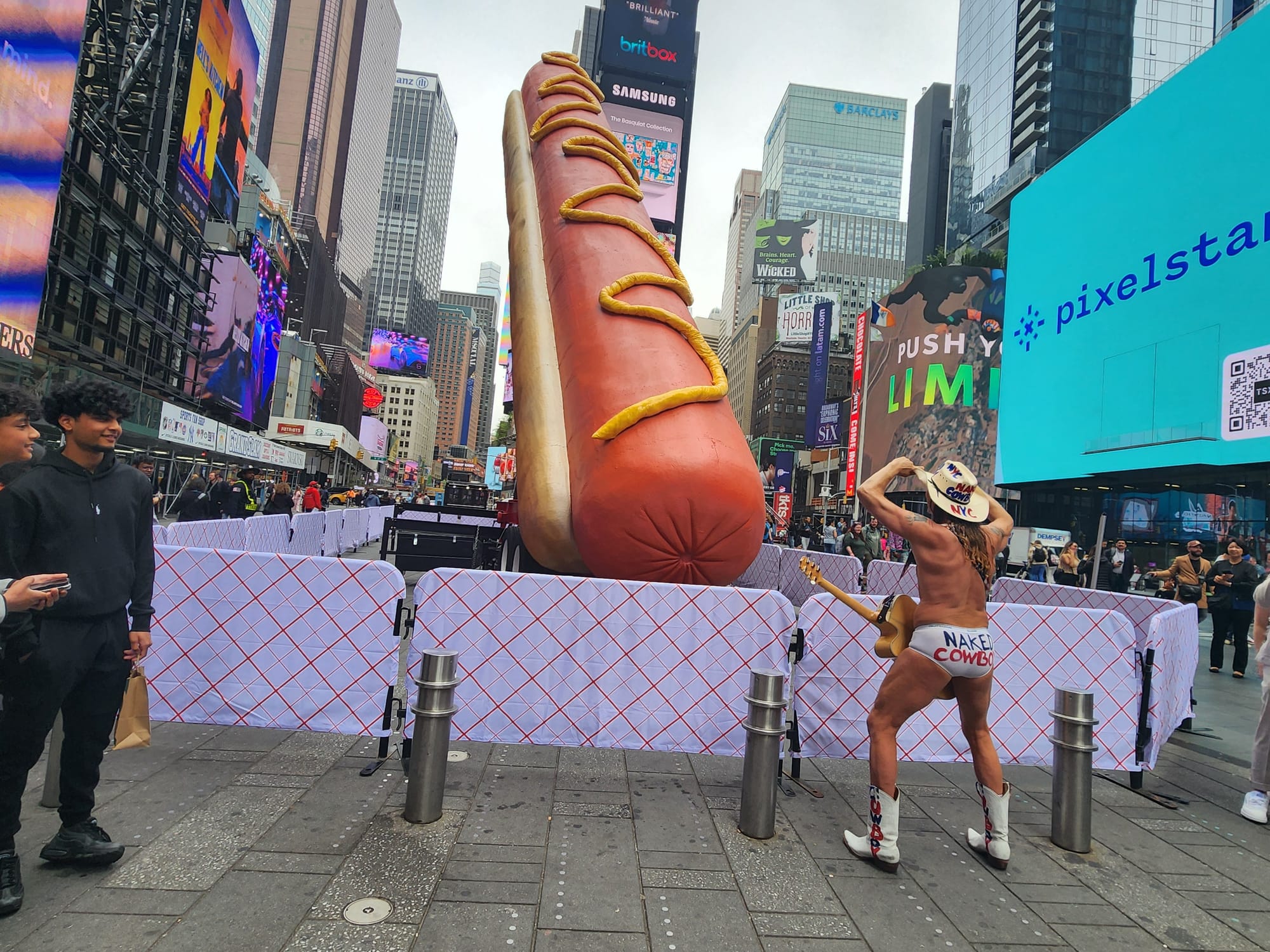 People from all over the world stopped in their tracks upon laying eyes on the enormous wiener, pausing to take photos of and with it, and even video-call their loved ones to make sure no one was missing out on the fun. Catron and Outlaw's "Hot Dog in the City" (2024), complete with puckered ends and a ribbon of mustard, not only enhances the entropy of Times Square, but also dominates the palate entirely amid the sensory overload of slow-moving crowds, creepy costumed characters demanding paid selfies, the infamous Naked Cowboy, and retina-singing digital billboards.