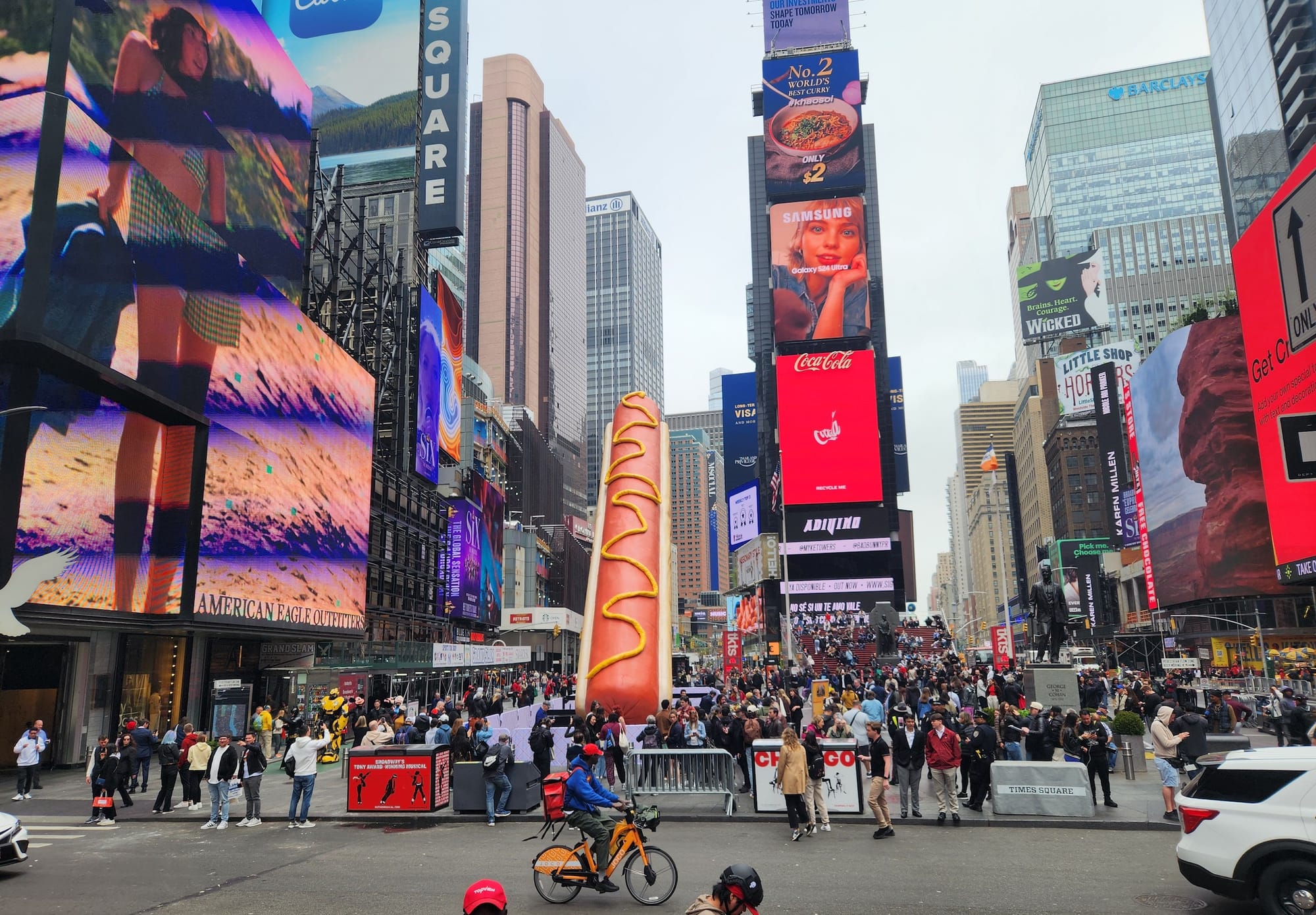 Tanya McQueen, Jeff Hicks, and Korey and Chris Benton, who landed in the city three hours earlier from Dallas, Texas, remarked that it was "about time the hot dog gets its own tribute" given all the hot dog stands on every corner. They were totally thrown off by the sculpture when their taxi pulled into Times Square, but found it inspiring enough to make a beeline to the closest hot dog stand after speaking with Hyperallergic.