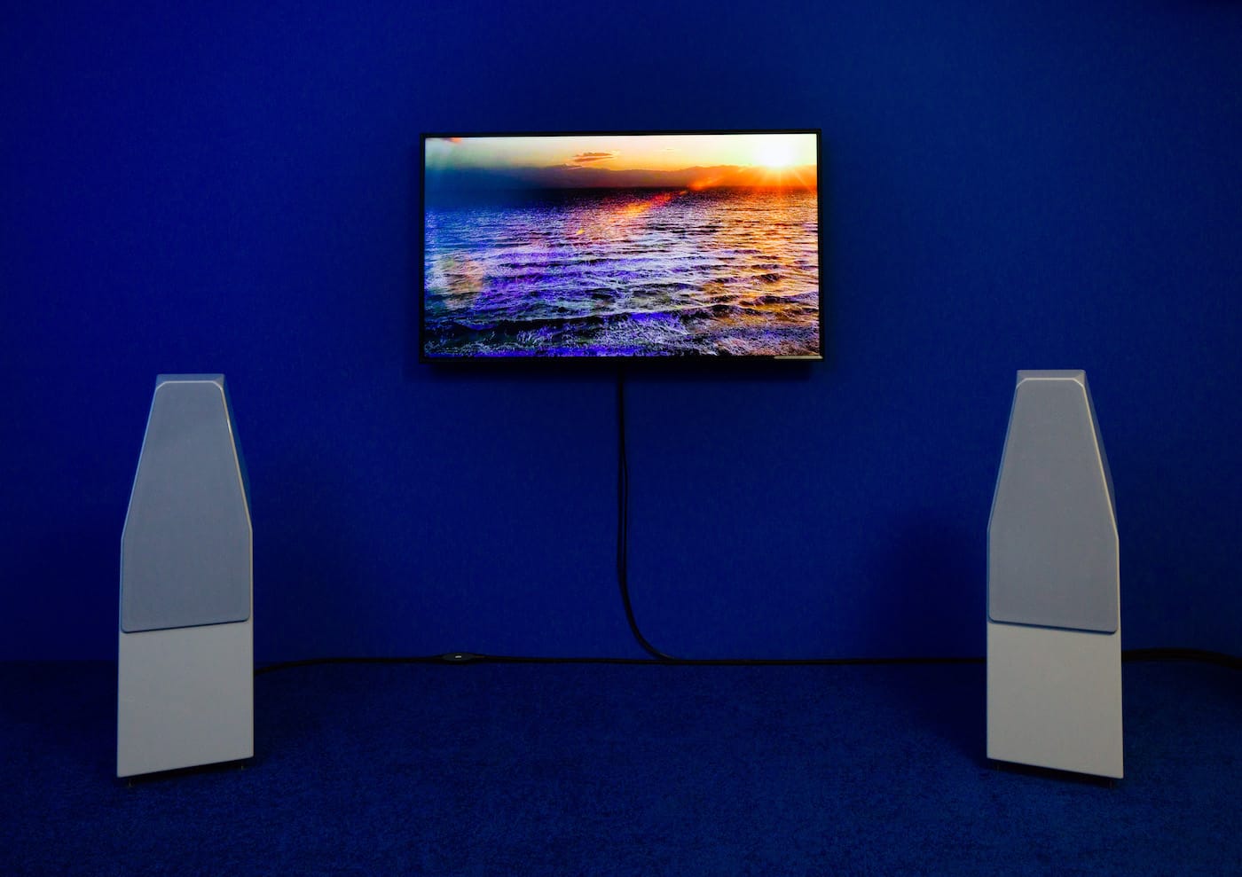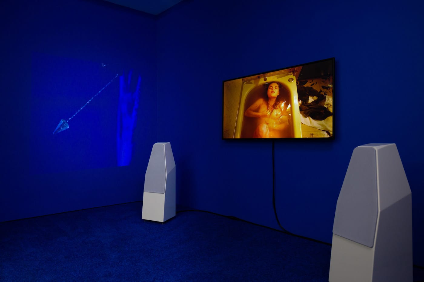 Jen DeNike’s “Queen of Narwhals” (2018), a 10-minute, three-channel video installation, is enveloped by walls painted a saturated blue, strengthening the sense of immersion. Like Bradford’s paintings, the video is populated entirely by women, but here they appear to be shapeshifters, devotees of a shamanistic cult of the sea. The color is rich, as is the sound (by Scott Haggart), and the slow pacing conjures the feeling of a séance. The core of the narrative concerns a young woman who has her tarot read, enters a bathtub, and through the remote magic of an elder is transformed into a narwhal at sea, recalling Irish myths of the selkie, a creature capable of morphing from seal to human (this association is strengthened by a Gaelic song in the soundtrack). The work is enchanting, but ends with a disappointingly crude CGI narwhal swimming a bit too stiffly — a letdown after the drenching beauty up to that point.