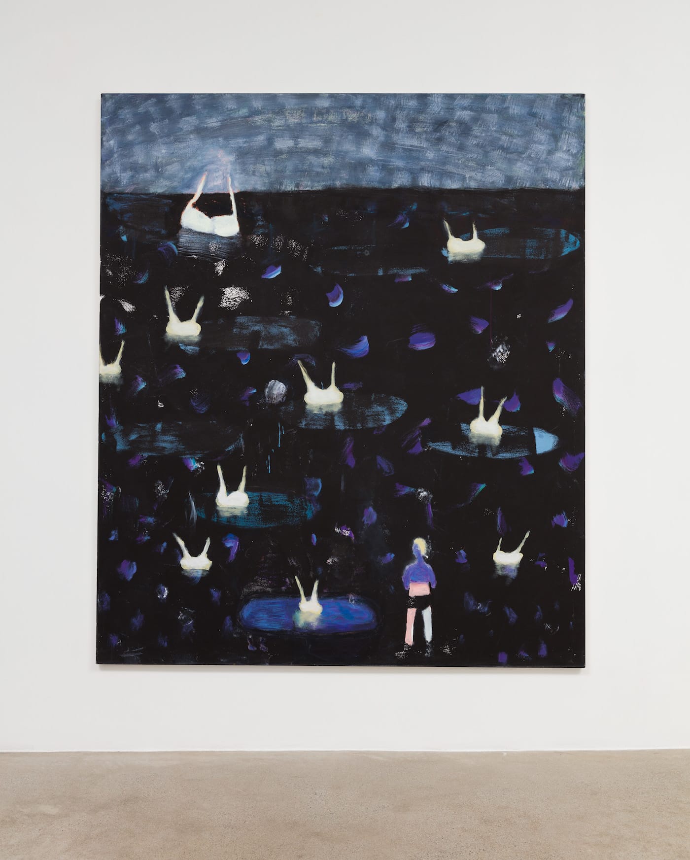 “Glass Ceiling” is at once overtly political and weirdly ambiguous. A figure of unspecified gender gazes out at a dark ocean upon which floats an armada of white bras, each as radiant as a lighthouse beacon. The canvas’s top margin is blotchy gray, a cloudy sky evoking the oppressive force of the painting’s title. A second, larger figure is barely visible, present mainly through its white hair and a dim outline against the surrounding night. The picture is a reverie before the sublime but also a massing of female power. Bradford’s image is altogether of this moment, digesting the professional barriers still faced by women in all fields, not least in the fine arts.