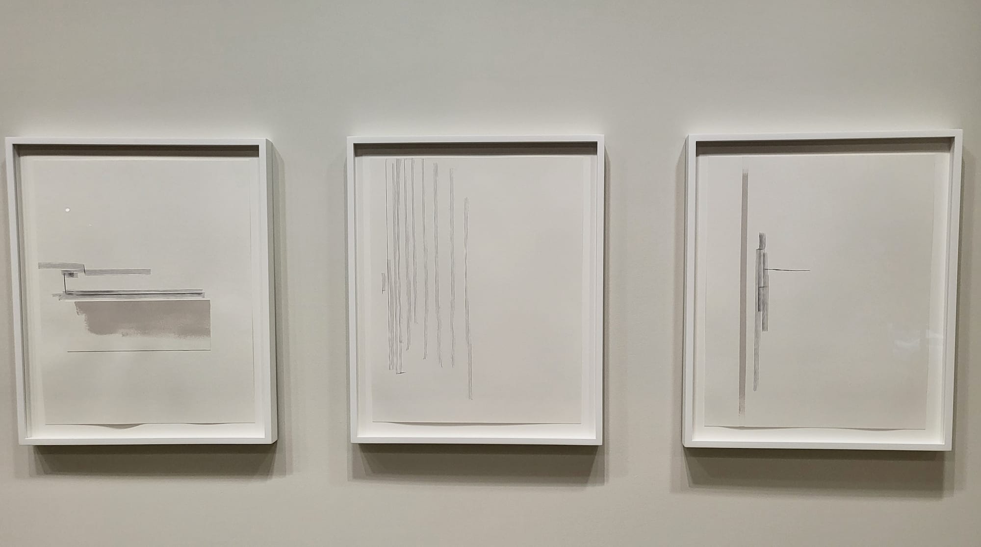 And there is delicateness in this show as well, particularly in the paper pieces that at first glance might be holding musical notation. In works such as "A Score for Tenderness and Grace," it takes a moment to notice that the orientation of the staves that are typically horizontal in music manuscript paper is vertical here and the lines are too close together. There are graphite lines that mass along one border and then a broad, washy stroke of ink nearby, and then a line heading off into the distance with its own hidden agenda. Much has been written and theorized about the profound relationship between music, particularly avant-garde music, and Jones's paintings and drawings, but here is where that relationship seems most palpable to me. These are quiet pieces, but they suggest an atonal drumming, a skittering sound in this distance that I can't quite pick up, but I imagine others can access. What Jones says in her conversation with Huey Copeland published in the 2015 exhibition catalogue Compilation is: