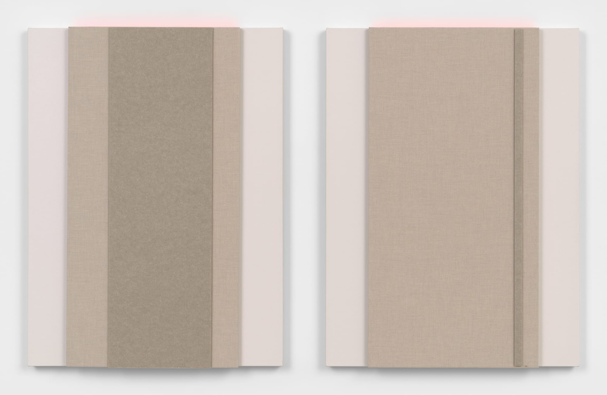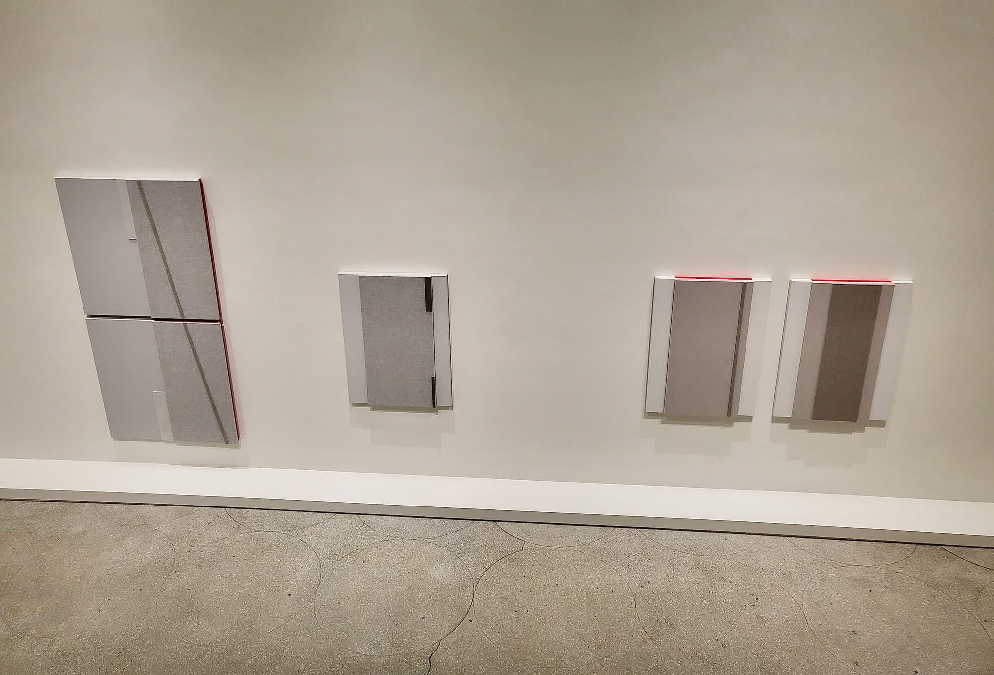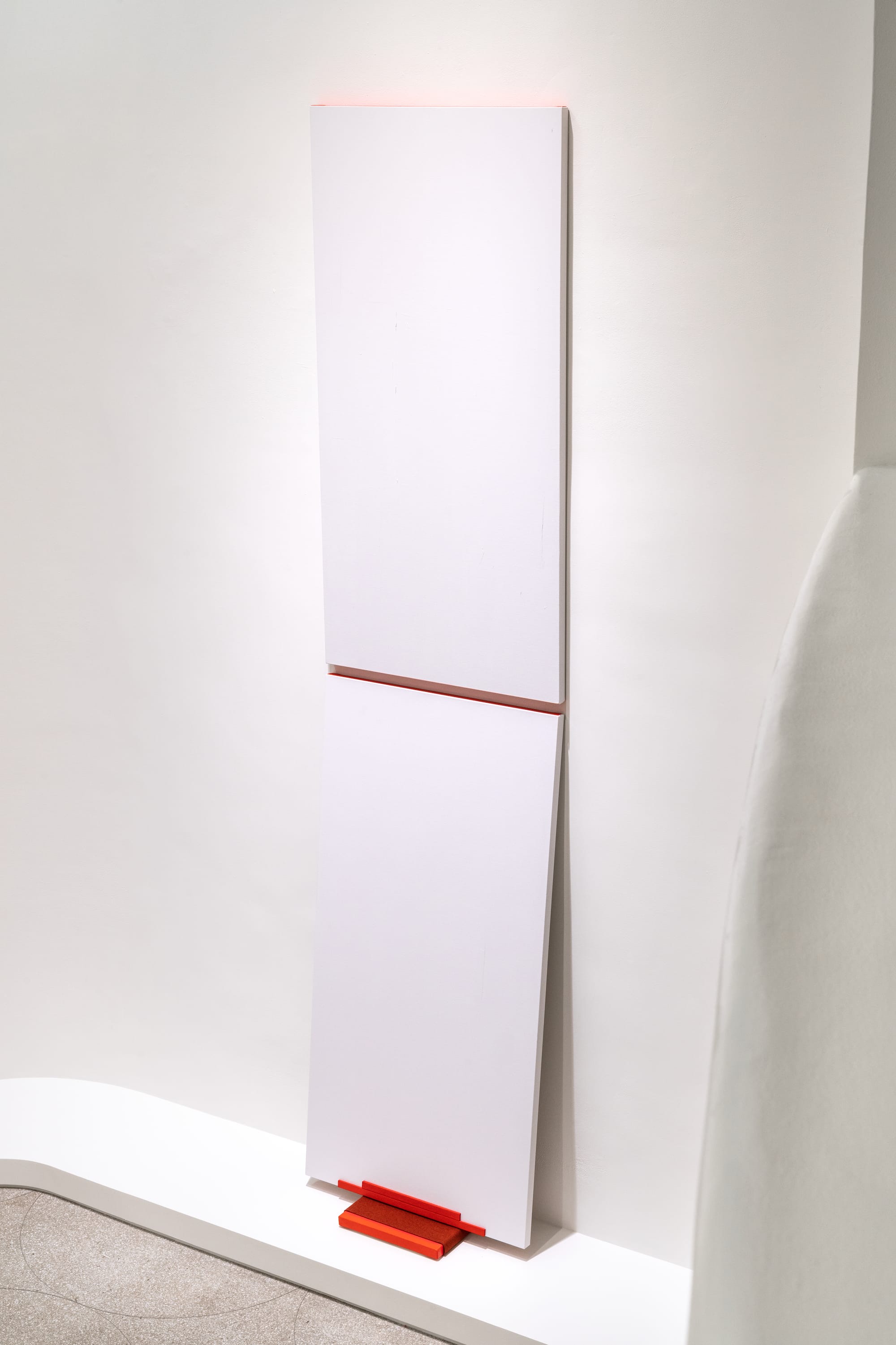 This is to say that Jones is playful and coy where Newman was white knuckling it. While Newman sweats it out, Jones is exacting but still mischievous. In the piece, “Neutral [Clef] Structure 1st & 2nd," (all works 2021), which consists of a side-by-side diptych of equally sized acoustic panels in varying tones of gray, though they seem to measure the same, everything on them is a little anomalous. None of the shapes are centered, and though all the painted shapes are variations of the rectangle, they don’t quite align. The middle quadrant isn’t quite in the middle, the right edge not the same width as the left edge. It’s a playful asymmetry that doesn’t seek so much to assert a certain kind of order, or declare what order should look like, as it is simply engaged in ongoing negotiations around balance and presence. And then there's the peekaboo effect of the small glow of red pigment along the top ridge of both pieces. In the work “To the Pedal Point,” which looks like one off-white painting almost on top of its twin, but with the bottom sibling angled against the floor as if acting as a wedge to keep her sister in the air, there is a seam of red between them and on top, and below, at the foot, there is some sort of red-painted foundation, with a corresponding red bracket on or against the lower painting. There is whimsy here and a little restraint.