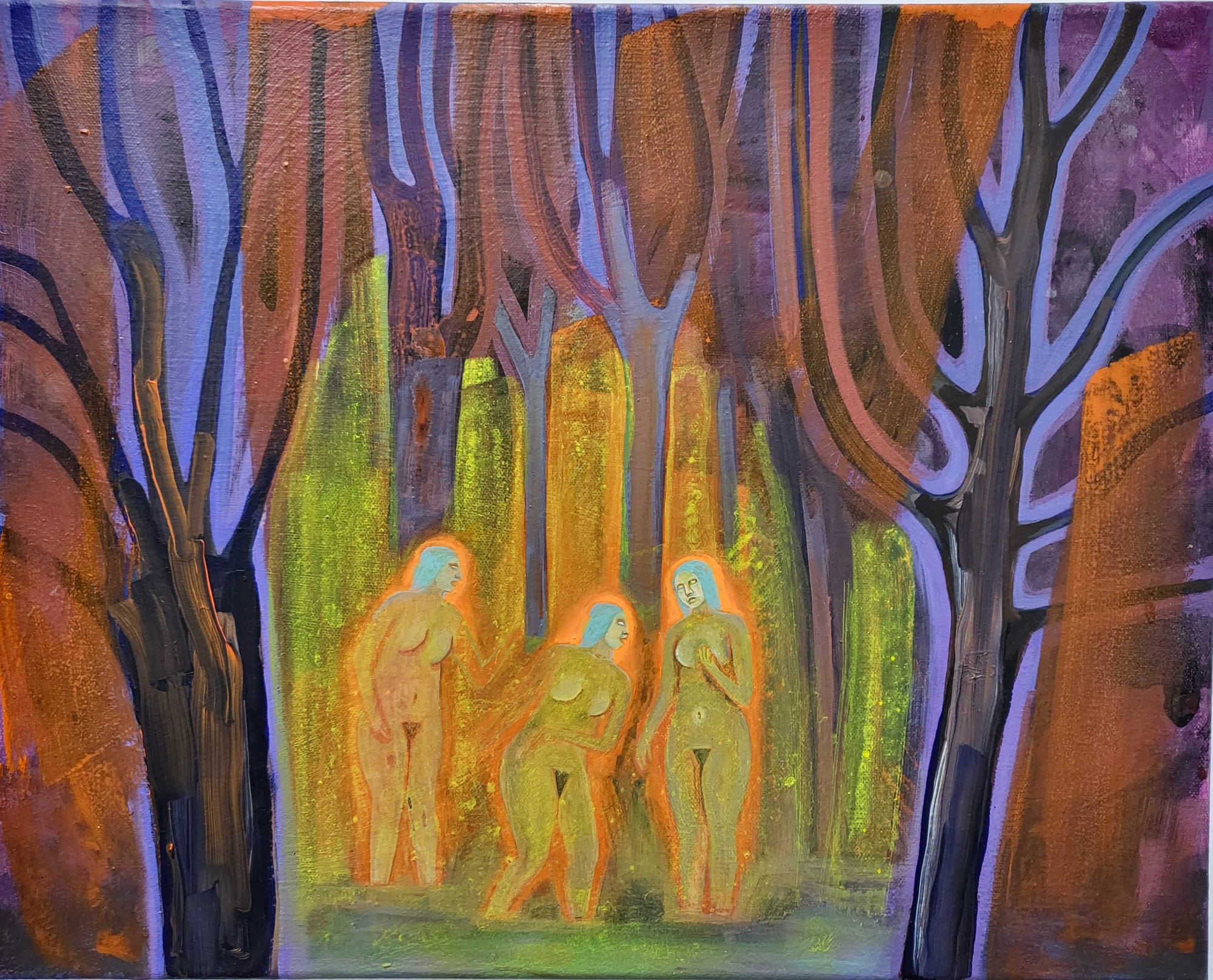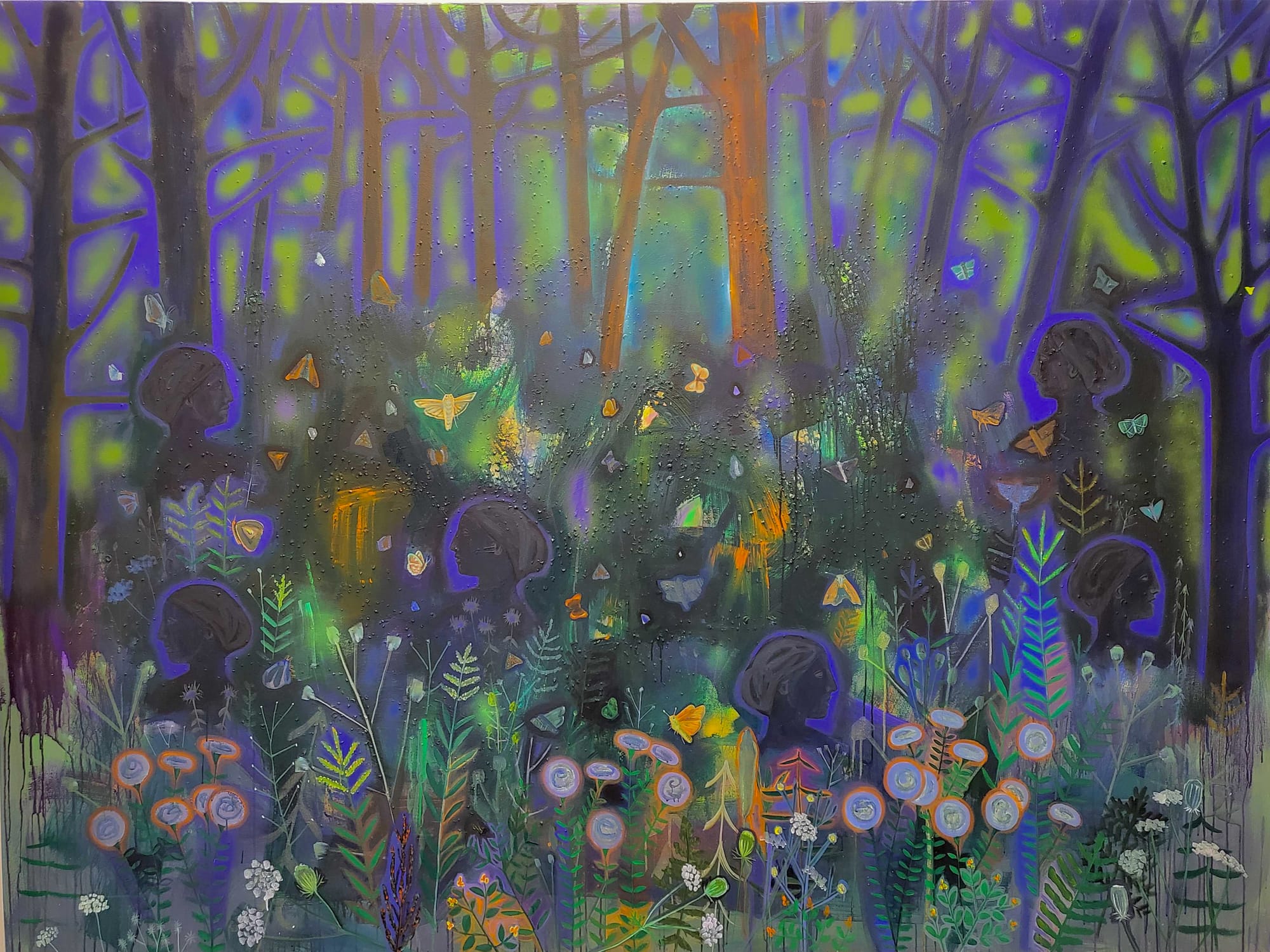 A thought experiment I sometimes engage in when looking at art is to ask myself what kind of god would make the world that is being represented or alluded to in the work I’m seeing. In my experience there are many gods: the god of second chances, travel gods, the god of small things, gods of wine and song. The painter Jennifer Coates evidently communes with the gods of luminous nighttime revelry. In her exhibition Lesser Gods of Lakewood, PA, Coates depicts a wildly active forest in a foreshortened picture plane that gleams here and there with crepuscular creatures that likely appear only when the sum total of human consciousness is in repose. In the wall-size painting “Dryads and Pollinators (Birds)” (2021) there are birds in flight, phosphorescent flower heads, trees awash in faerie dust, and the heads of female figures that seemingly grow in tandem with the flora here.