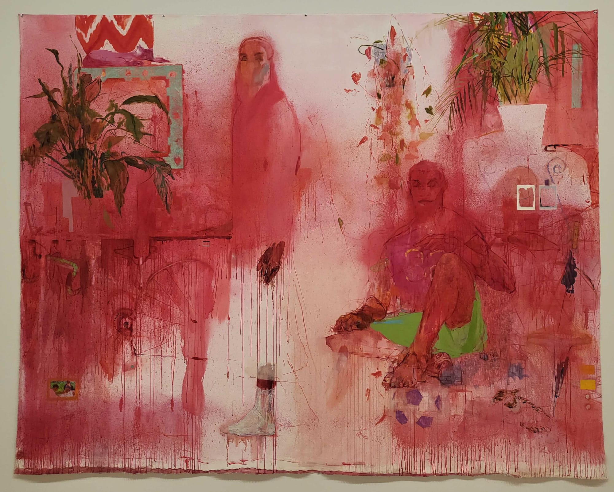 Look at the painting “A Lesson in Longing” (2019). I stood looking at it and then sat to look some more. It took at least a couple minutes to notice that a cat lies on something in the upper left corner, beneath what might be a tapestry, on top of what might be a picture frame or a television screen. The pictorial elements waver between being heavily substantial like the male figure’s feet, and being gossamer, like the legs of the woman who appears to be wearing a niqab, and also being intermittent such as the cat in the foreground that might indeed be a cat, or a swirl of calico yarn. Most everything again, is unsure, a maybe, might be there, might not be, could fulfill your hopes, might leave them by the side of the road. And this is the ultimate prize of this show, from piece to piece my looking is rewarded by moment to moment discoveries. And by my constitutive seeing, these figures' being becomes meaningful to me.