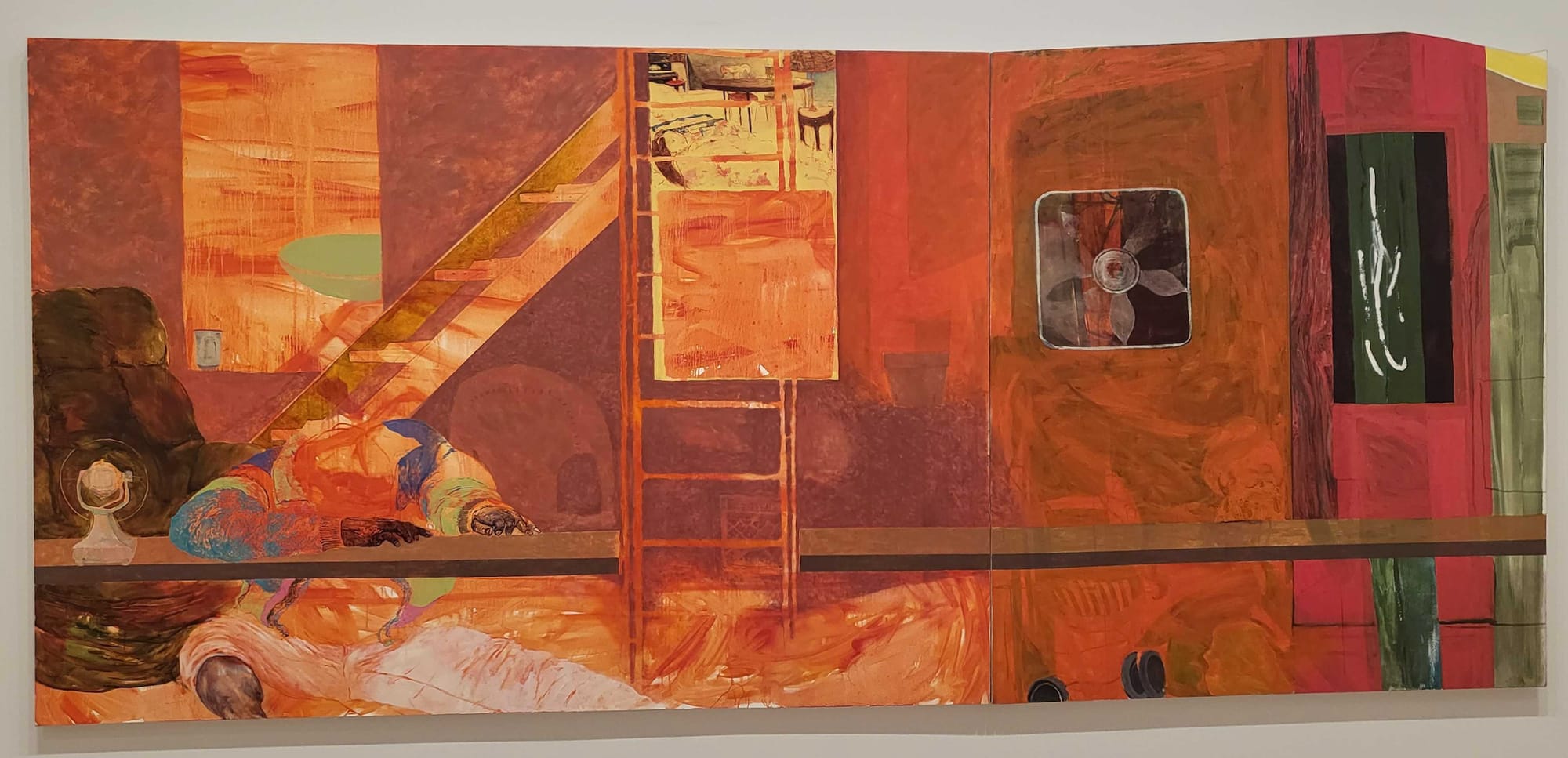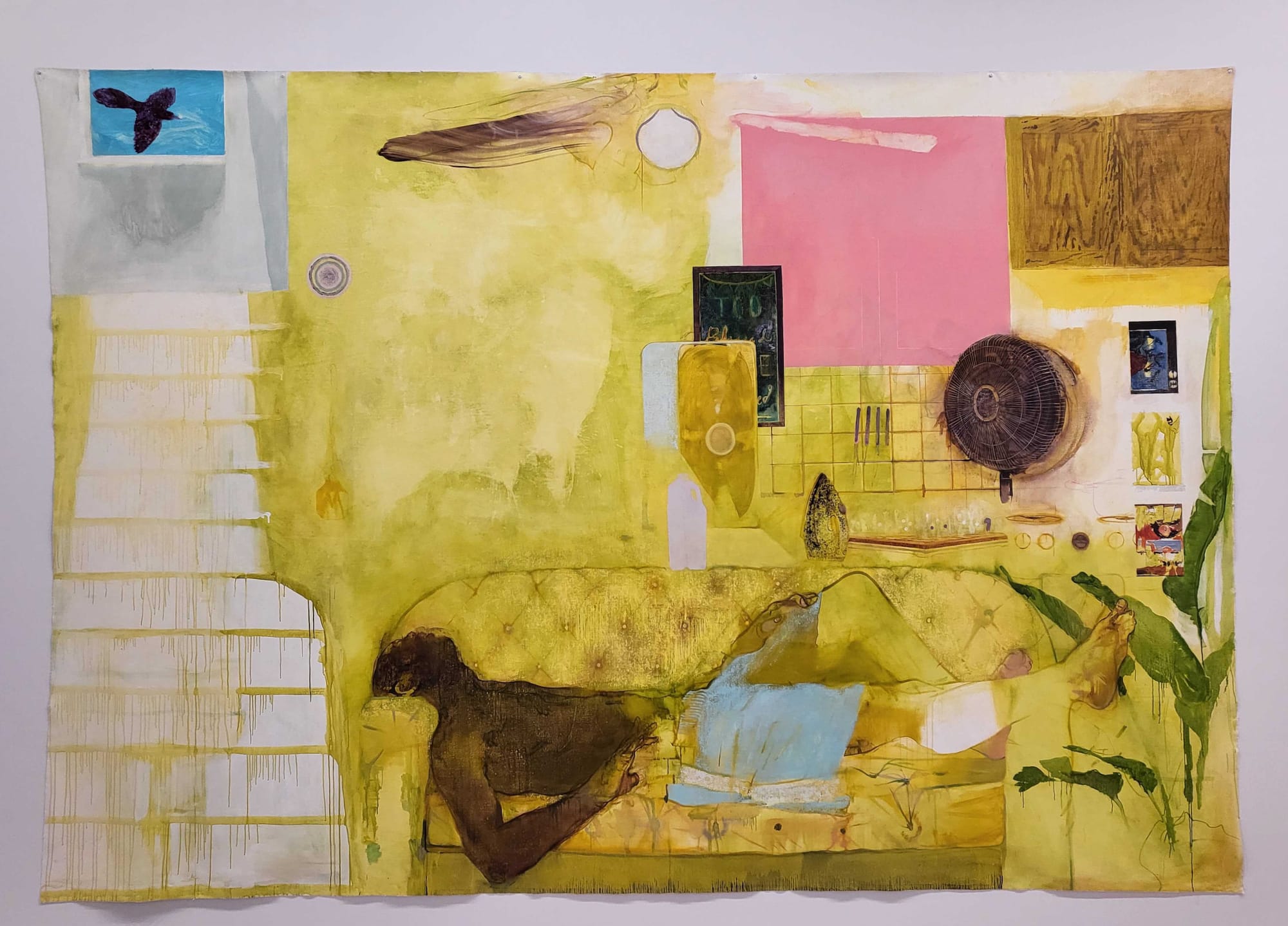 In the painting “Blessed Are Those Who Mourn (Breonna! Breonna!)” (2020) the corporeal world in certain moments becomes ephemeral, gauzy. A calf muscle goes alabaster white. A ceiling fan is caught mid-cycle, the whoosh of one of its arms arrested but leaving a chem trail, the other arm ghostly white again against a pink backdrop. This fan is primarily made recognizable by the bright white bulb at its center with the blades seeming like they have been set in motion and thereafter can only be glimpsed in short bursts of apprehension. There are actually three fans in the room, a fact which can only become evident after a long time looking at the image. The one in the middle, just above the reclining figure’s raised thigh is a box fan, its blades frozen in a blur of four blades held mid-stroboscopic effect so that I can’t tell in what direction they are turning. And the image of the fan is broken by an intervening milk carton so that the machine seems to float. Most everything in this room is tenuous, piecemeal, precarious.