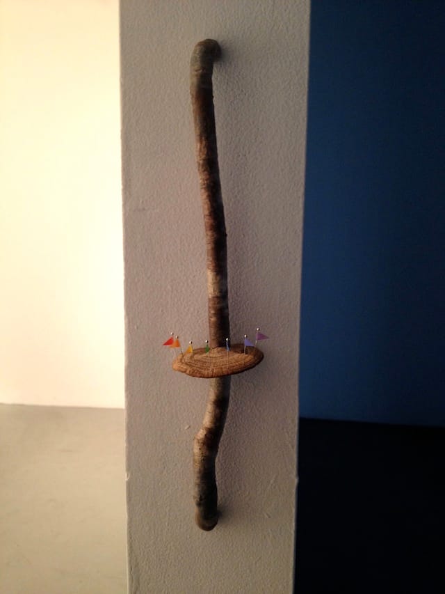 In addition to the larger works, Kendler miniaturizes the rainbow flag sculpture. At the entrance of the exhibition space, tiny rainbow flags ring a fungal disk attached to a wooden, handle-like branch that’s mounted onto the wall. The repetition of forms, as Kendler echoes, is something we see in nature — trees, mushrooms, and wood branches exist ad-nauseum in the outside world, repeating without exactly replicating. Kendler plays with this idea throughout the exhibition; she is, after all, creating her own fusion landscape. Her small pieces add ornamental touches to the themes that the artist expounds upon in the larger works.