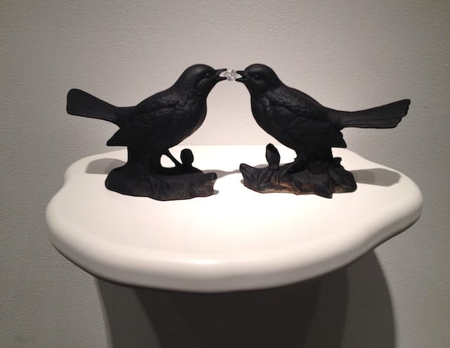 Kitschy birds abound in other small sculptures like “Reclaim (Mirror Test)” (2012), an eerie twinning of two black birds. Rather than flitting off into the distance, the birds face each other, balancing a single tiny jewel in their beaks. Are we cloning and manufacturing animals like factory farming gone wild, or are these naturally occurring moments? And more importantly, is there even a difference anymore? Kendler’s surreal assemblages provoke such probing questions.