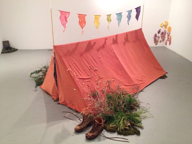 Two interactive works ground the exhibition, drawing the viewer into the narrow, rectangular, white gallery space. “Therianthropy” (2012) (seen at top) is an orange tent with rainbow-colored pennants hanging horizontally on a string above it. The rainbow colors Kendler uses suggest a two-fold meaning — rainbows are both naturally occurring reflections of light in water droplets, and manmade symbols of bliss and gaiety (sexual or not). The pennants outside the tent reference the former, yet recognize man’s interest in reinterpreting and appropriating the rainbow. An array of furs line the interior of the tent; viewers are invited to partially undress and enjoy the feeling of their skin rubbing against the fur that once belonged to a warm, living, breathing animal body. “Therianthropic” means “partly bestial and partly human in form,” which is exactly the division one experiences in this piece.
