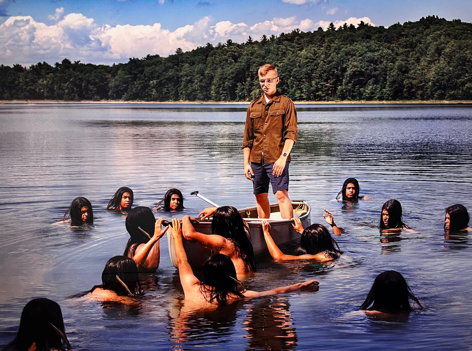 The irony in Jeremy Dennis’s Open Conflict at Aicon Contemporary is that the conflicts between Indigenous and non-Indigenous people are staged to be conspicuous yet their White-presenting subjects barely notice them. In one metal-print photograph, “Nothing Happened Here #2” (2016), the White subject stands before a red-painted wooden lodge, impaled by a dozen arrows; an expression of subdued pain betrays a stoic body. In another, “Wake" (from the Rise series) (2019), a White figure with a quizzical expression stands in a canoe, encircled by over a dozen Native American swimmers (each a photoshopped image of Dennis himself, who is an enrolled Tribal Member of the Shinnecock Indian Nation).