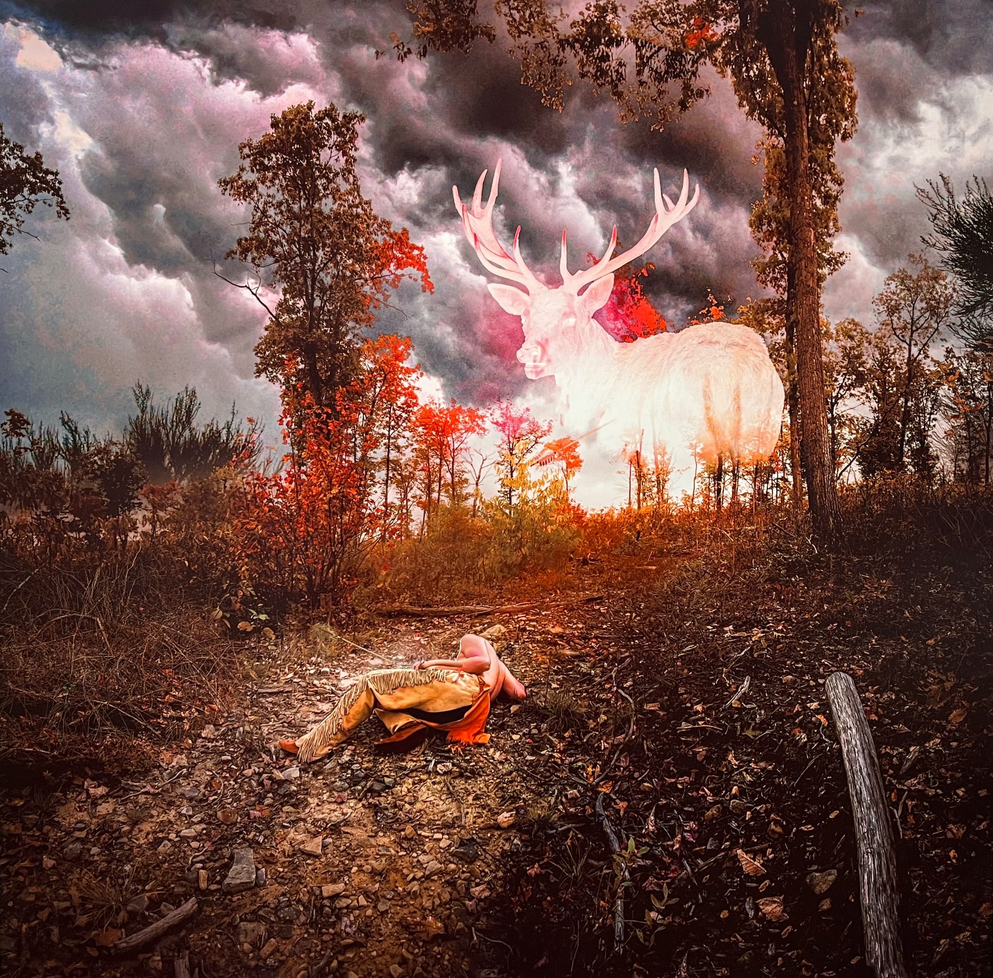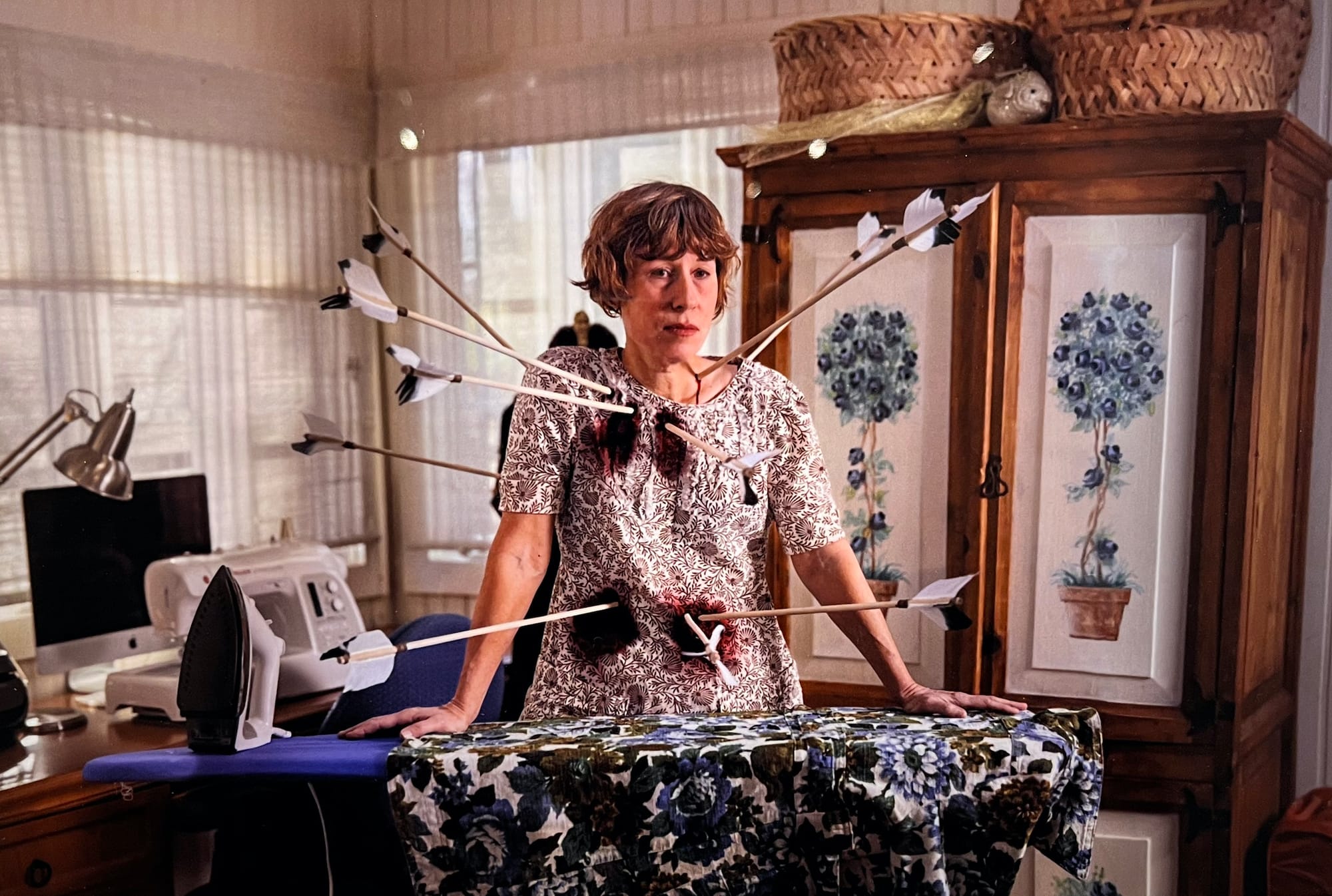 The exhibition gathers together several of the artist’s photographic series, most made before 2020 and all portraying scenarios regarding US colonialist legacies so theatrical that they verge on farce. The most memorable among them is Nothing Happened Here, whose title and contents convey the absurd degree of repression among White settlers and their descendants. In “Nothing Happened Here #21” (2018), a White woman rests her arms on an ironing board, seemingly lost in thought; 10 arrows pierce her neck and torso, leaving large blood spots staining her patterned dress. Likewise, in “Nothing Happened Here #3” (2017), a bearded White man wearing a plaid shirt strikes a pensive pose on a footbridge in the woods. The folksy image would feel at home in an L.L. Bean catalogue, except for the half dozen arrows lodged in his torso.