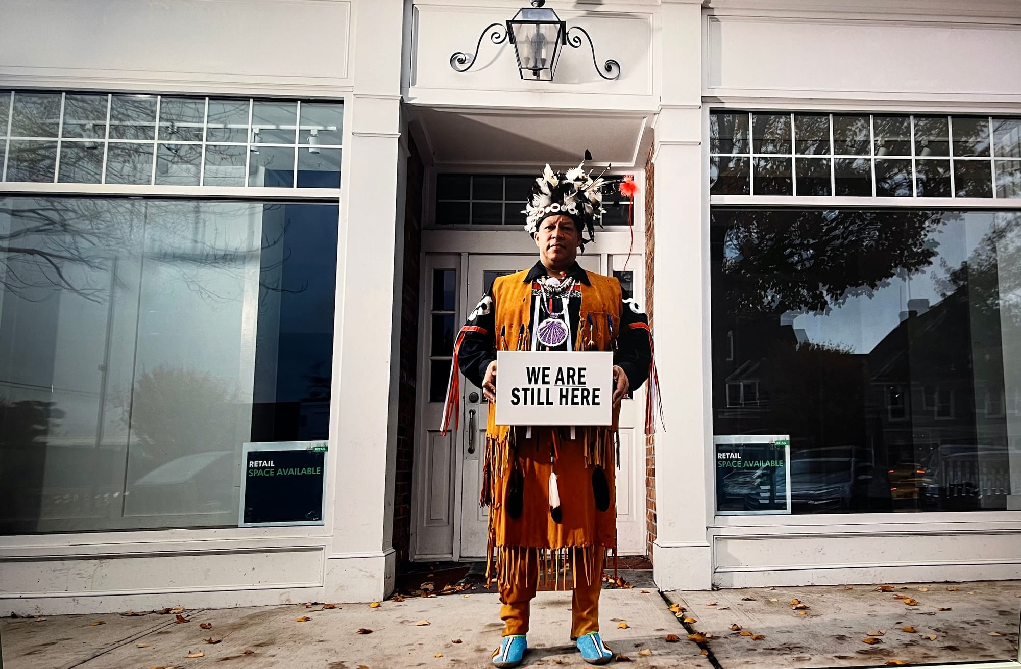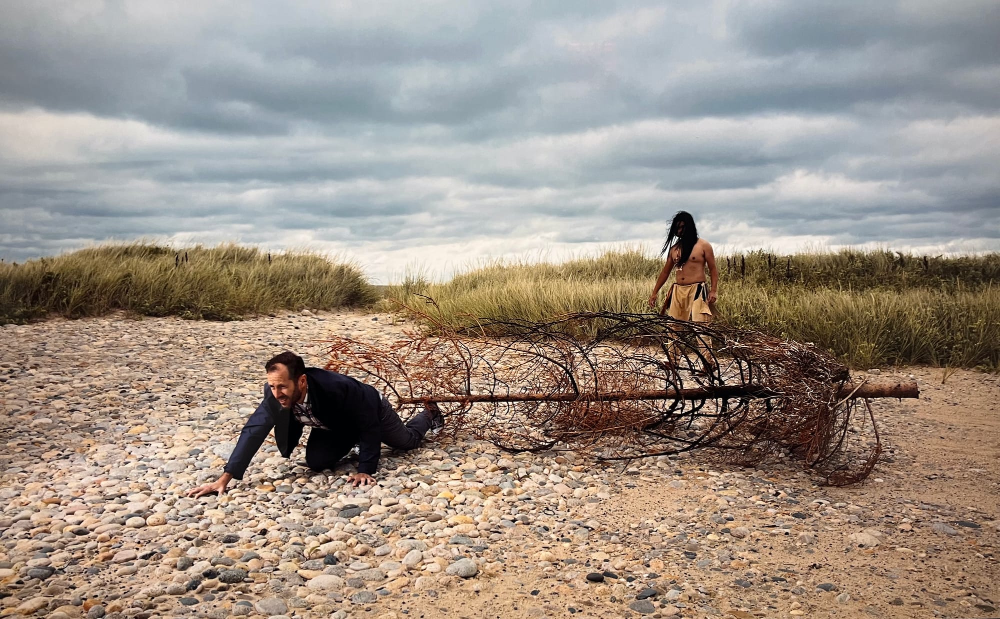 Dennis is not going for subtlety, and his approach works best when he commits to a provocative, well-executed conceit. “We Are Still Here” (2016), for example, depicts a Native American man standing in the doorway of a vacant Main Street-style rental space, painted white, with “RETAIL SPACE AVAILABLE” signs in its windows. The man wears traditional Native American clothing and holds a sign that reads, “WE ARE STILL HERE,” playing on assumptions based on colonialist narratives about Indigenous identity and assimilation, presence and absence. “Dream of a New World” (2019), on the other hand, in which a White man in a suit crawls on a rocky beach as a shirtless Native American man looms behind him, lacks the same visual and conceptual punch.