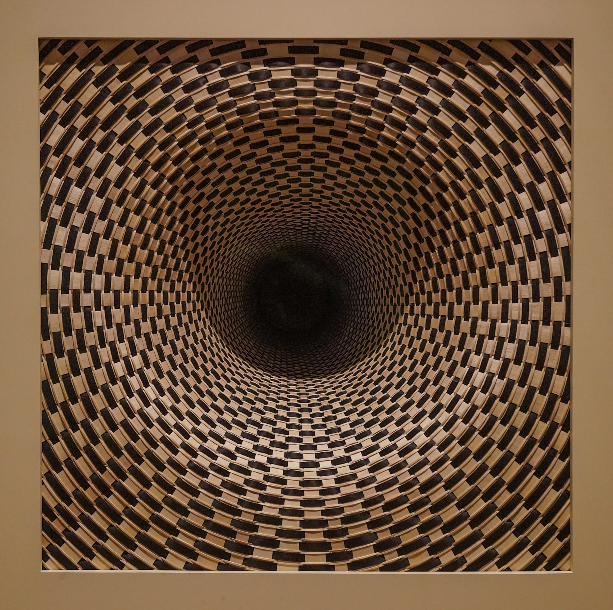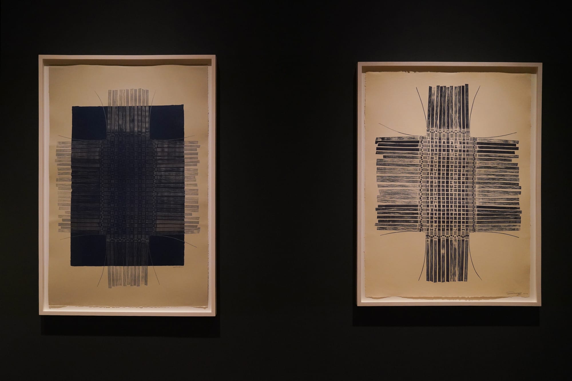 One section of the show spotlights artworks that veer away from vase and vessel forms, yet still converse in a basketry vernacular. A 2022 series of untitled relief and embossed prints, made by inking flattened ash designs and running them through a printing press, bear woodgrain-textured imagery that resembles crosses, suns, and starbursts. “Caesura” (2023), a lone piece of woven wall art actually recedes into the museum wall, like a concave Lee Bontecou sculpture. Looking into it, you might feel like you’re peering into a vessel, about to be pulled into a vortex, or inside a passageway to another era.