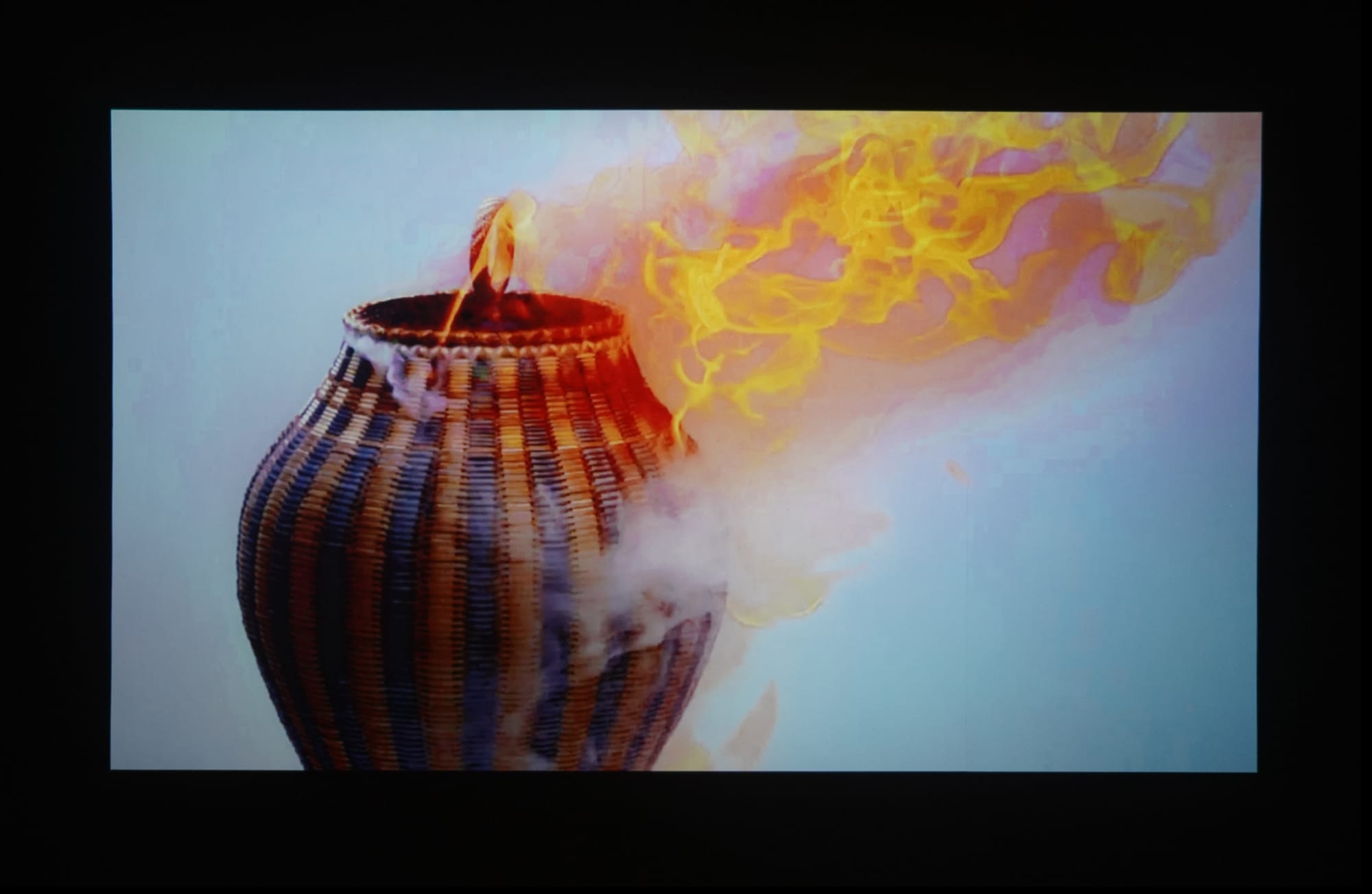 The exhibition concludes with his aforementioned art film, “Ash." In the final scene, Frey places a finished ash basket on a plinth in a white-walled space. Smoke suddenly billows through the slats. Flames engulf the vessel, turning ash tree to ashes.