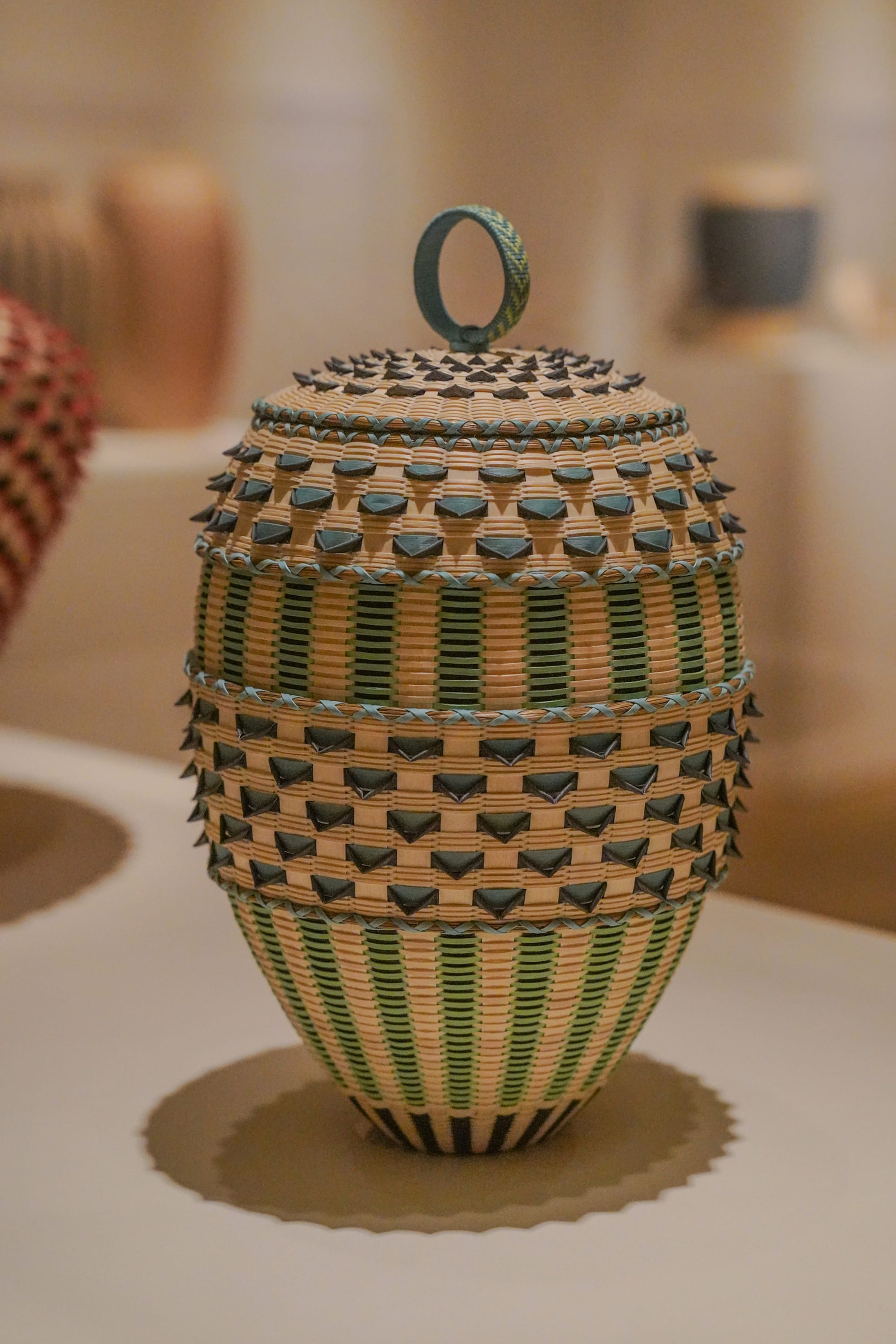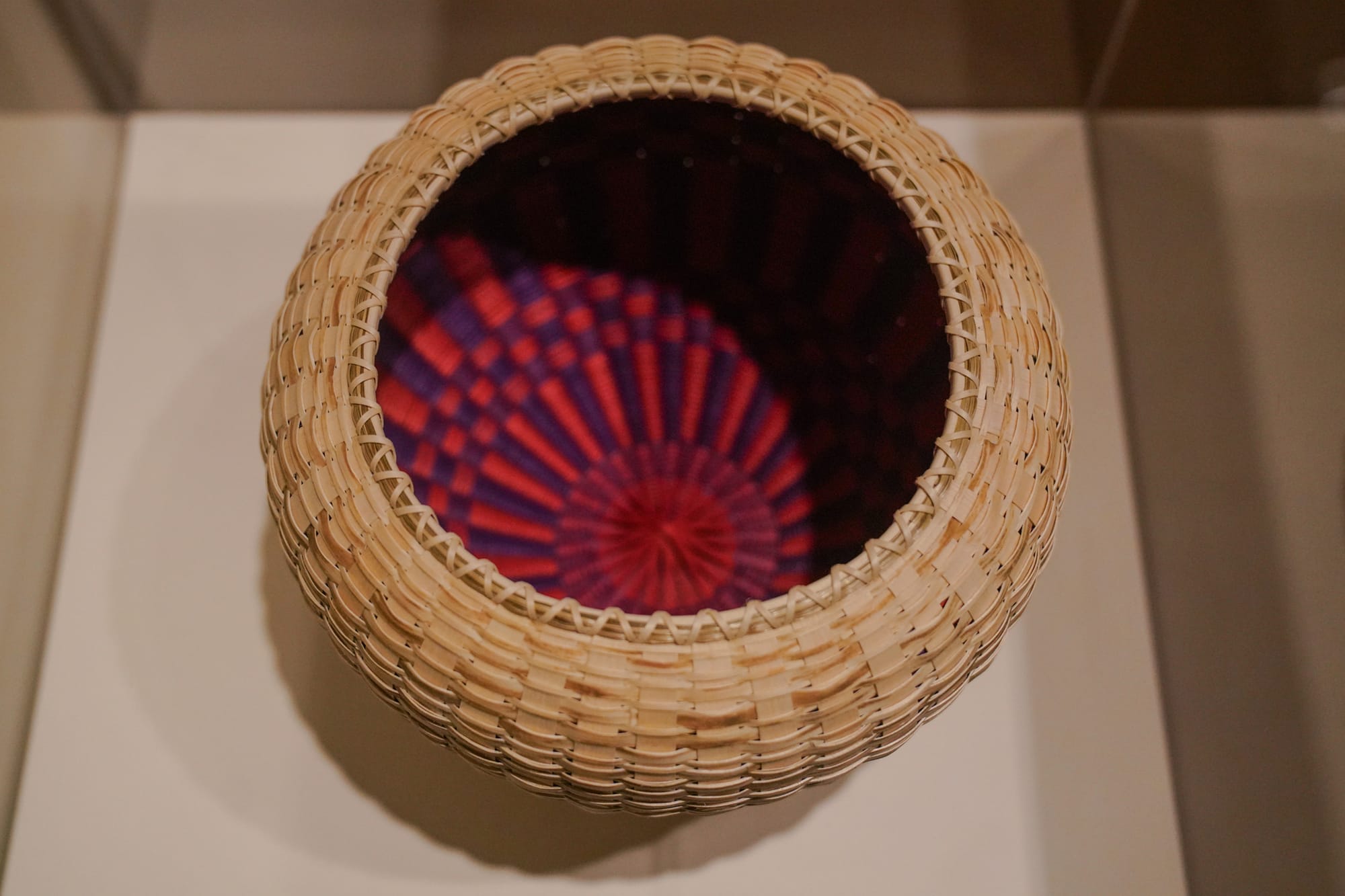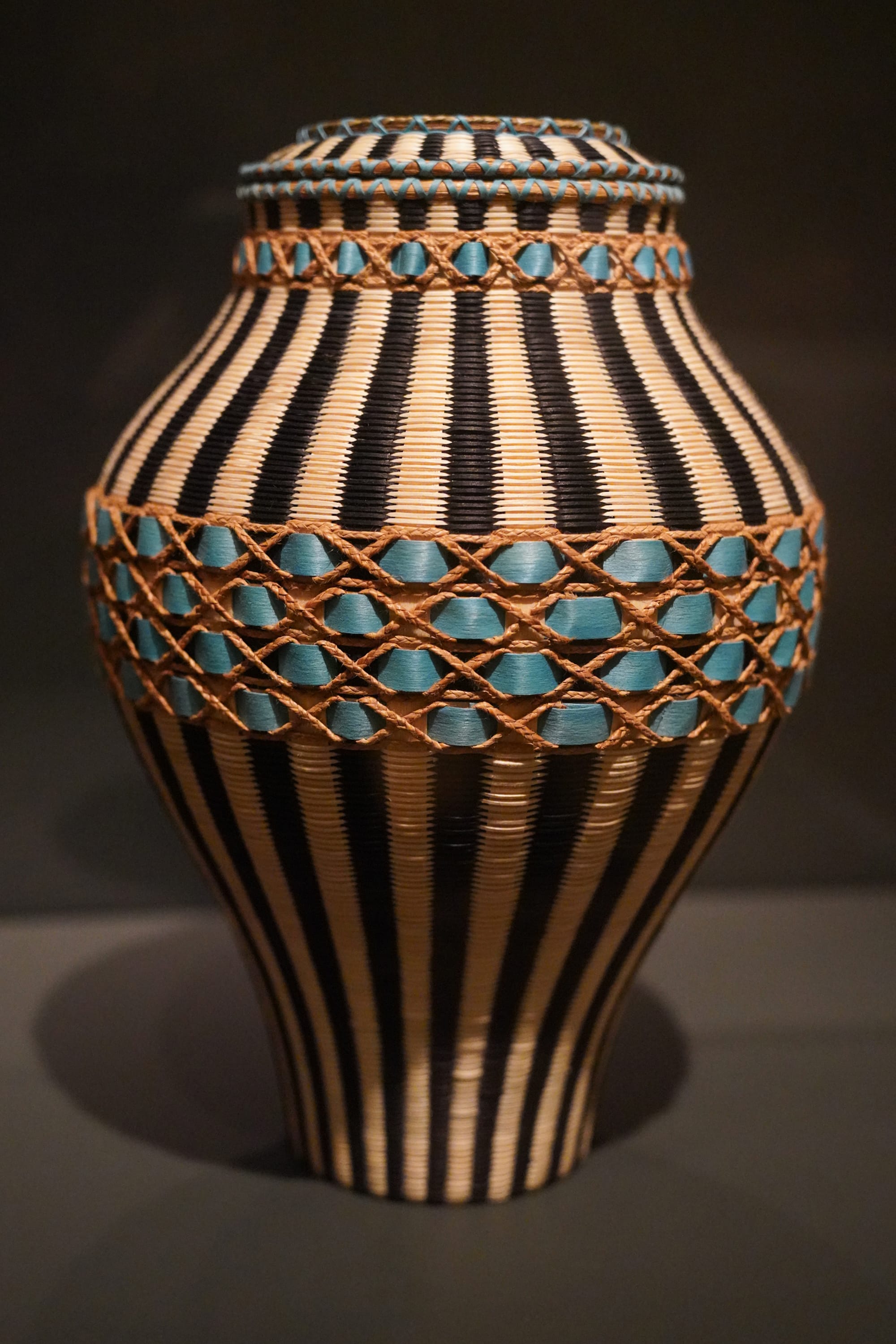 Frey’s basket-sculptures range in shape and size from squat, spiky forms inspired by sea urchins (a traditional Passamaquoddy food source) that you could cradle in open palms to tall, sleek, fine-weave vases and vessels too wide to circle your arms around, as in “Watchful Spirit” (2022), an intricate and voluminous commission for the Denver Museum of Art, which took Frey six months of concentrated labor to complete. Some vessels are topped with circular finials, others with quillwork lids depicting animals and insects made with quills salvaged from roadkill porcupines — though you may need to stand on tiptoes and crane your neck to see the creatures, given the height of the exhibition’s display cases. A staggered series of rims crown “Biased Top Basket” (2013), and double-walled works harbor secrets. With its muted, undyed exterior, for instance, “Navigating Tradition” (2023) looks like an understated, undyed vessel from some angles. But the interior holds a surprise, bursting with color: a vibrant violet-and-red checkered fine-weave number. The piece encapsulates one of Woven’s recurring themes: the push-and-pull dynamics of tradition and innovation within this enduring Indigenous art form.