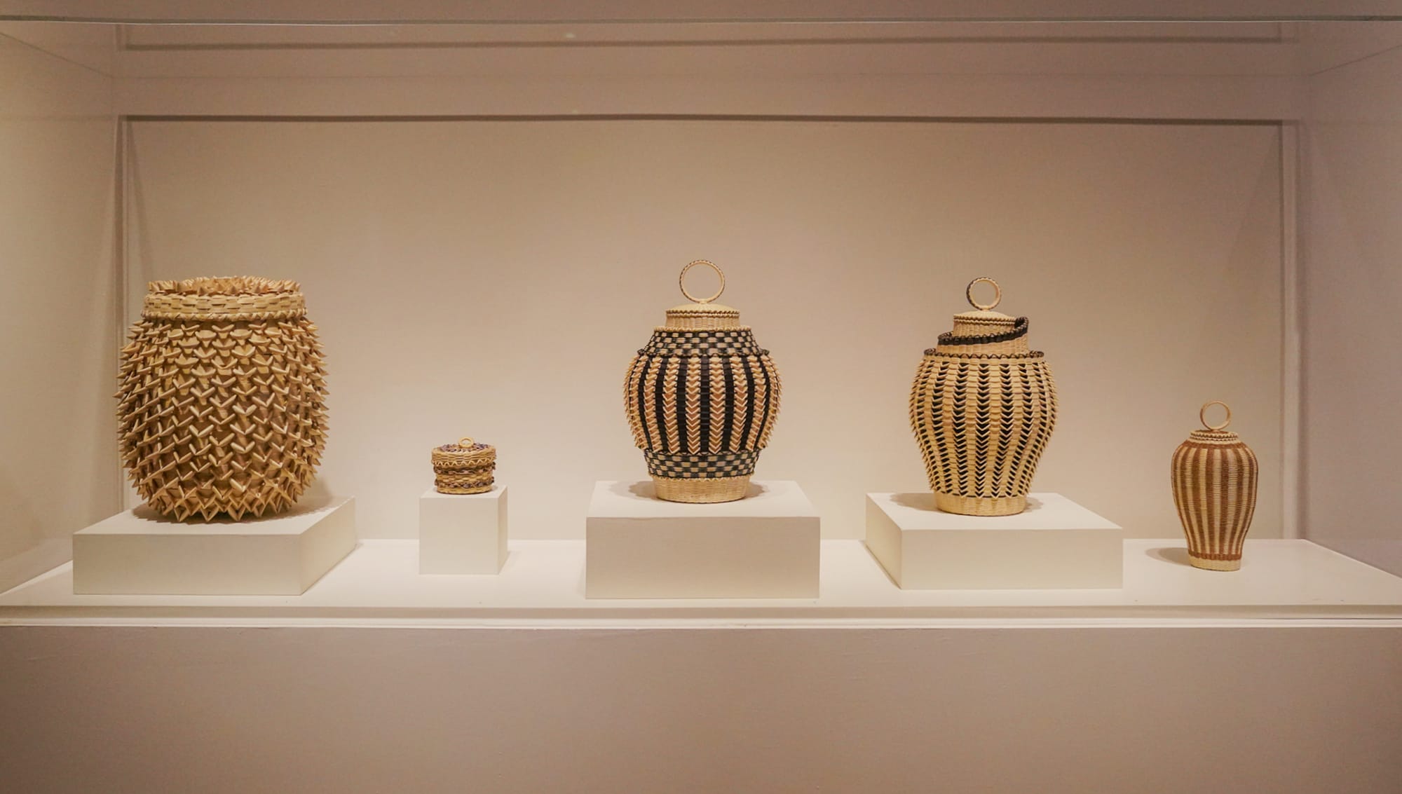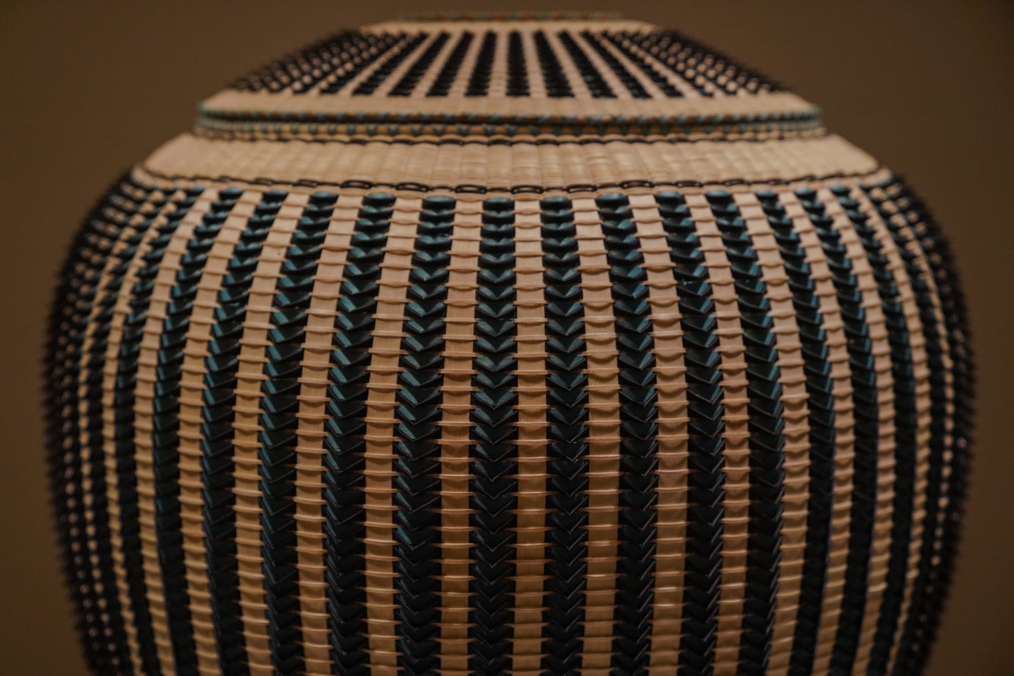 Showcasing the visual language of Wabanaki basketry and Frey’s inventive additions to the lexicon, this mid-career retrospective traverses the artist’s first two decades as a sculptor. Organized in a rough chronology, starting with his early works (2003–12), Woven traces the ways Frey’s work builds on traditional techniques, including qinusqikon (porcupine or point weave), a weaving method marked by triangular, thorn-like protrusions, and apsoshokunwe (fine weave), in which the wood is gauged down to super-thin strands.