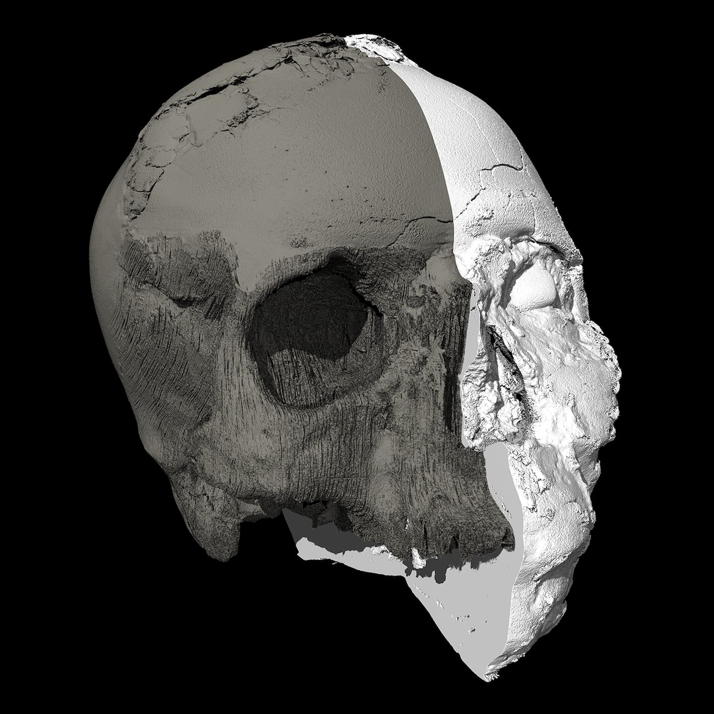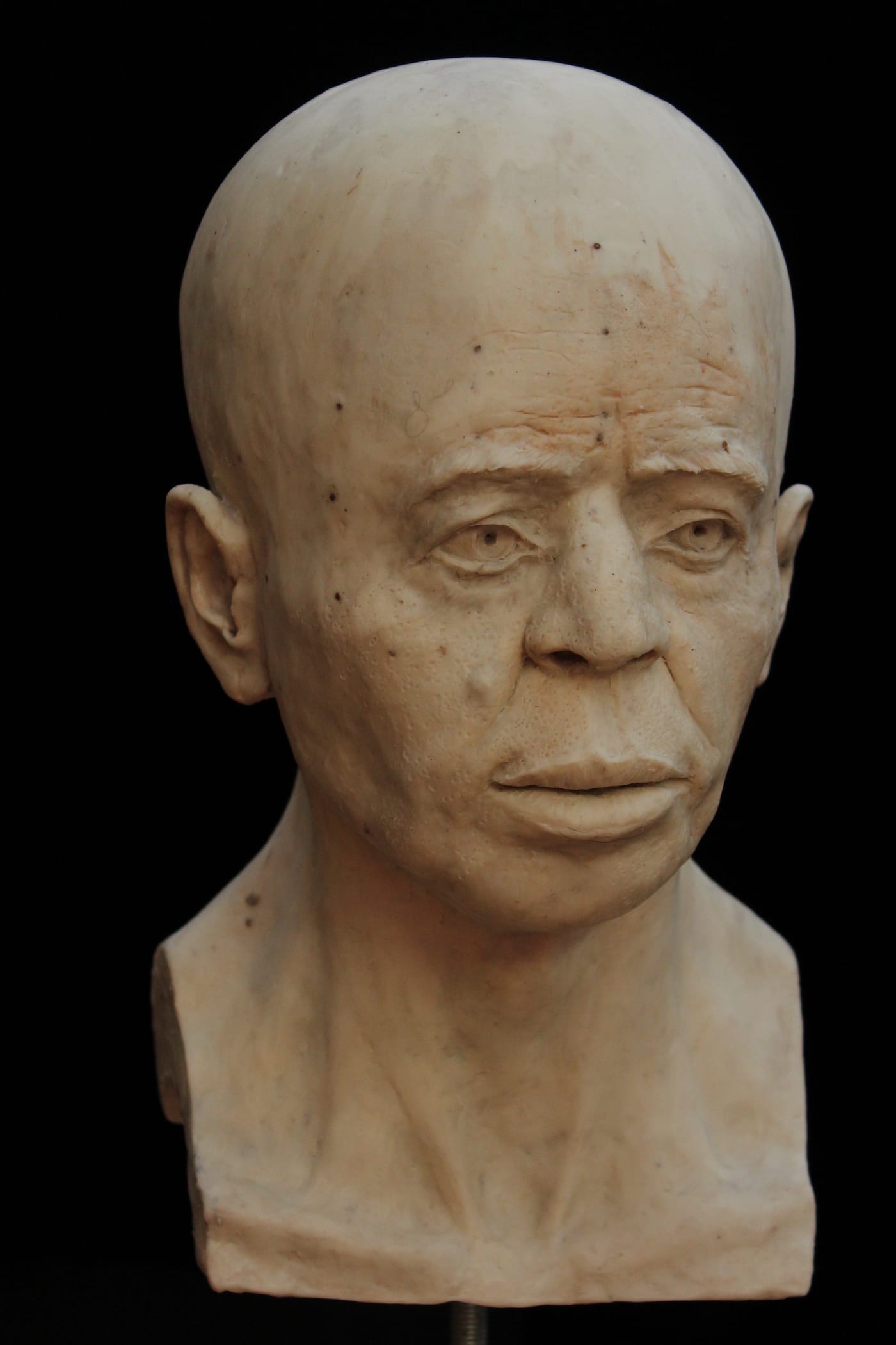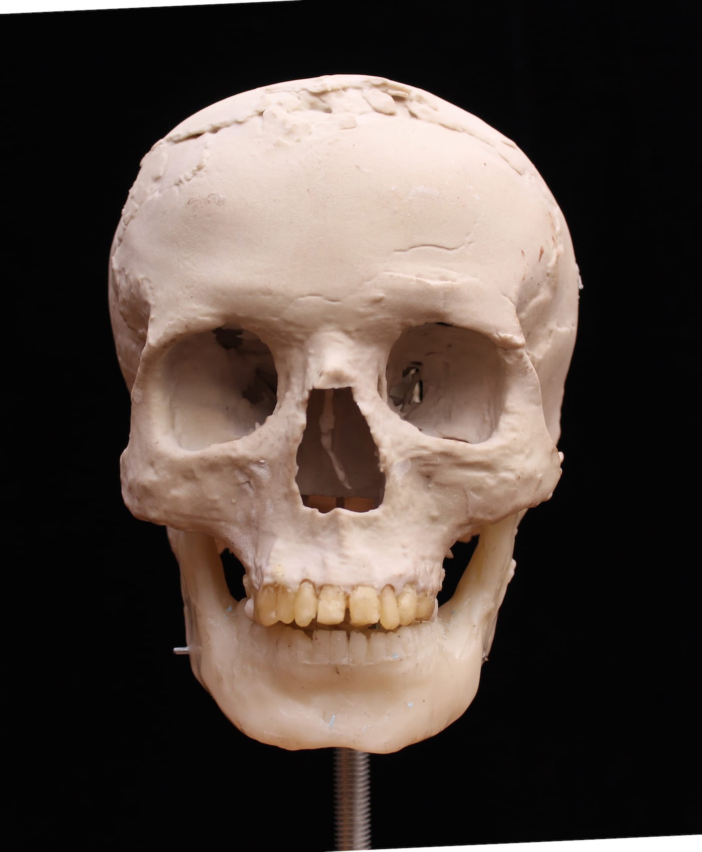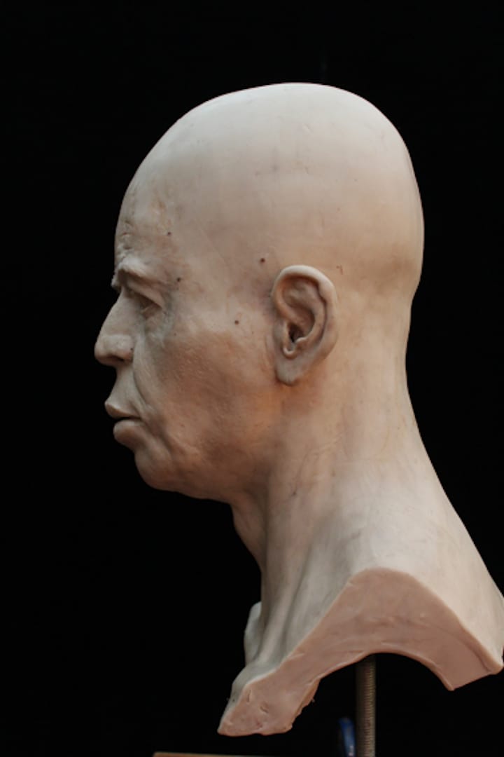 The imaging team conducted its own sculptural process, but one, of course, aided with the latest digital technologies. Experts first digitally separated the shape of the skull bones from the overlying plaster then converted data from a micro-CT scan to create a 3D-printed model of the cranium. As the mandible was not present, the team added a lower jaw constructed based on data from other known examples of human mandibles of similar age and geographic origin. The face was then built over the skull model — this time, in a more traditional sculptural process: experts used clay and wax to build features from the bone-up, muscle by muscle, creating every anatomical detail before topping it off with a clay layer of tissue and skin. Finally, they made a mold of the head from which the displayed face was cast in Jesmonite — essentially a mixture of gypsum and acrylic resin.