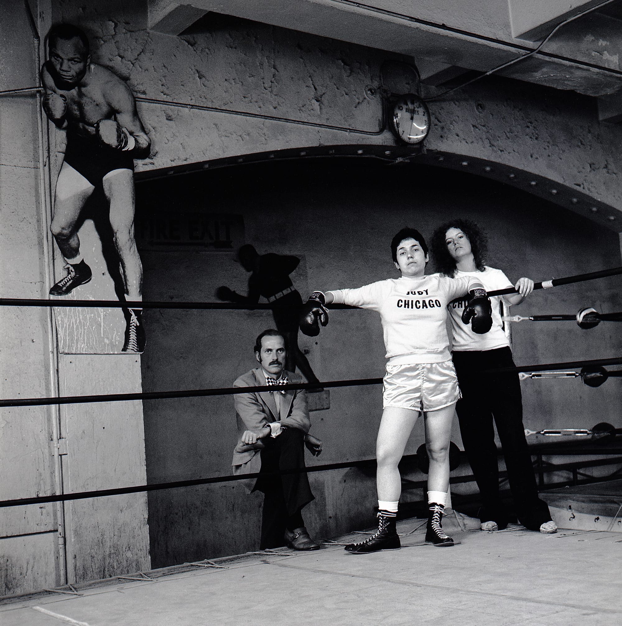 Besides portraying the all-male artists of Ferus Gallery’s “cool school,” McMillan took iconic photographs of women artists, including Barbara T. Smith and Judy Chicago. To announce Chicago’s name change in 1970 — she adopted her birth city as her last name — McMillan rented a boxing ring and captured her wearing a shirt bearing her new moniker and boxing gloves. Chicago stares back at the camera, stone-faced, a fighter who could hold her own in the male-dominated art world.