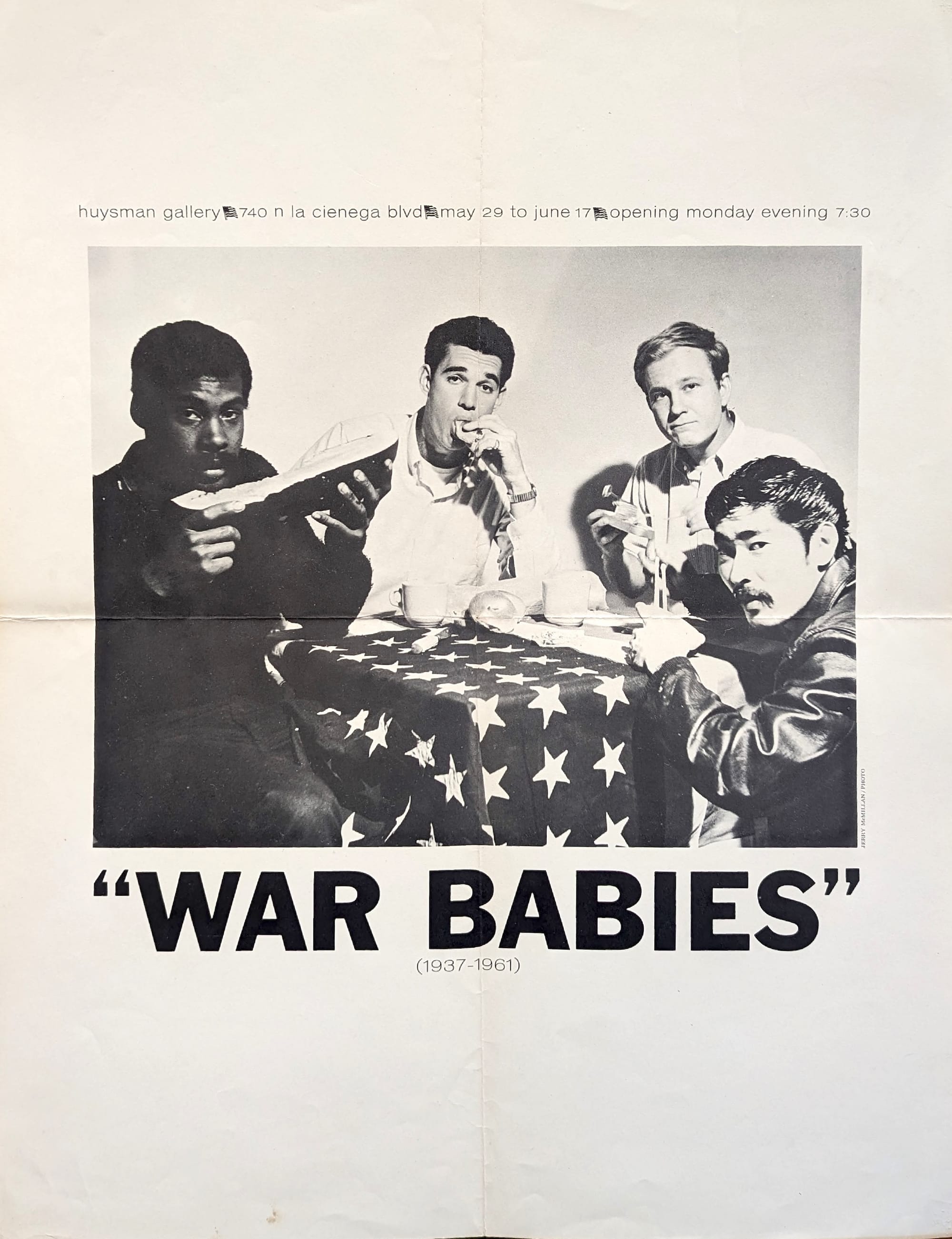 McMillan was also responsible for the controversial image that accompanied the War Babies exhibition at LA’s Huysman Gallery in 1961, a notable early multi-racial exhibition. In McMillan’s photo, the four artists sit around a table draped with a United States flag, each eating a stereotypical food: African-American artist Ed Bereal with a watermelon, Catholic Joe Goode holding a mackerel, Ron Miyashiro (who is Hawaiian-Japanese American) posing with chopsticks and a bowl of rice, and Jewish artist Larry Bell with a bagel. A poster that featured the photo was widely disseminated, garnering attacks from the right for its supposed desecration of the flag, and from the left for its portrayal of ethnic stereotypes.