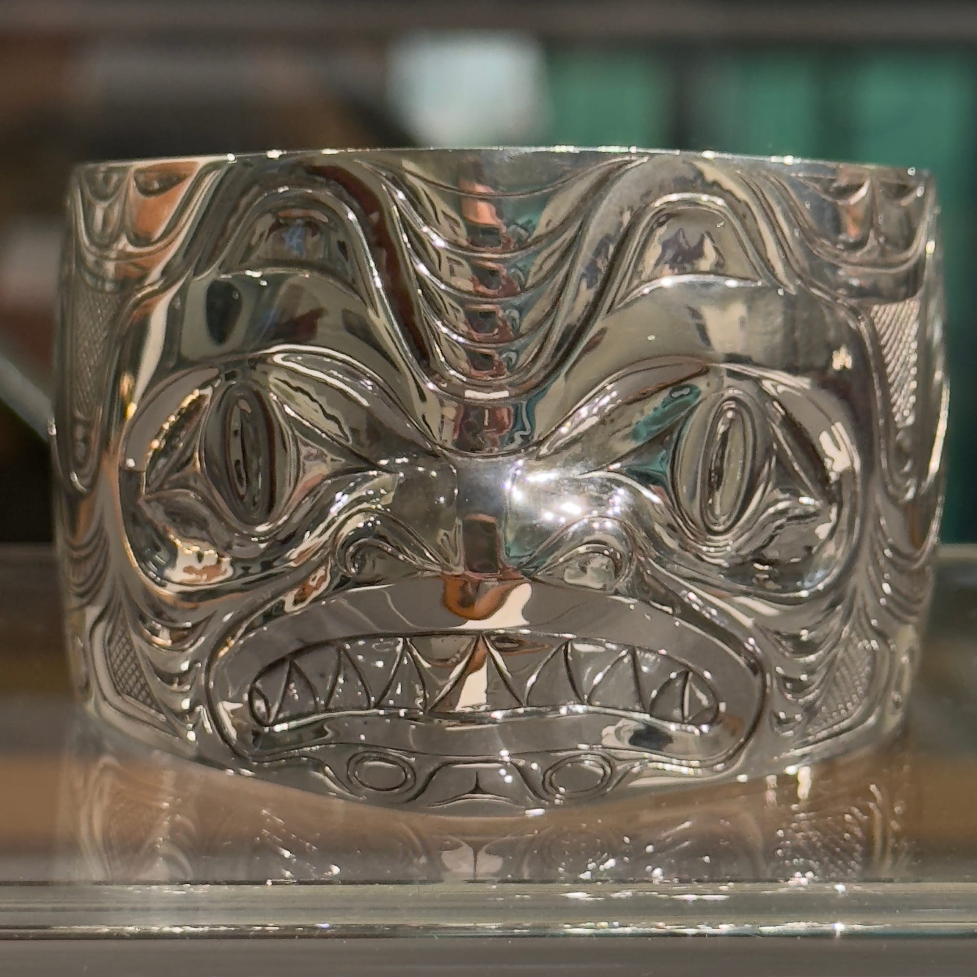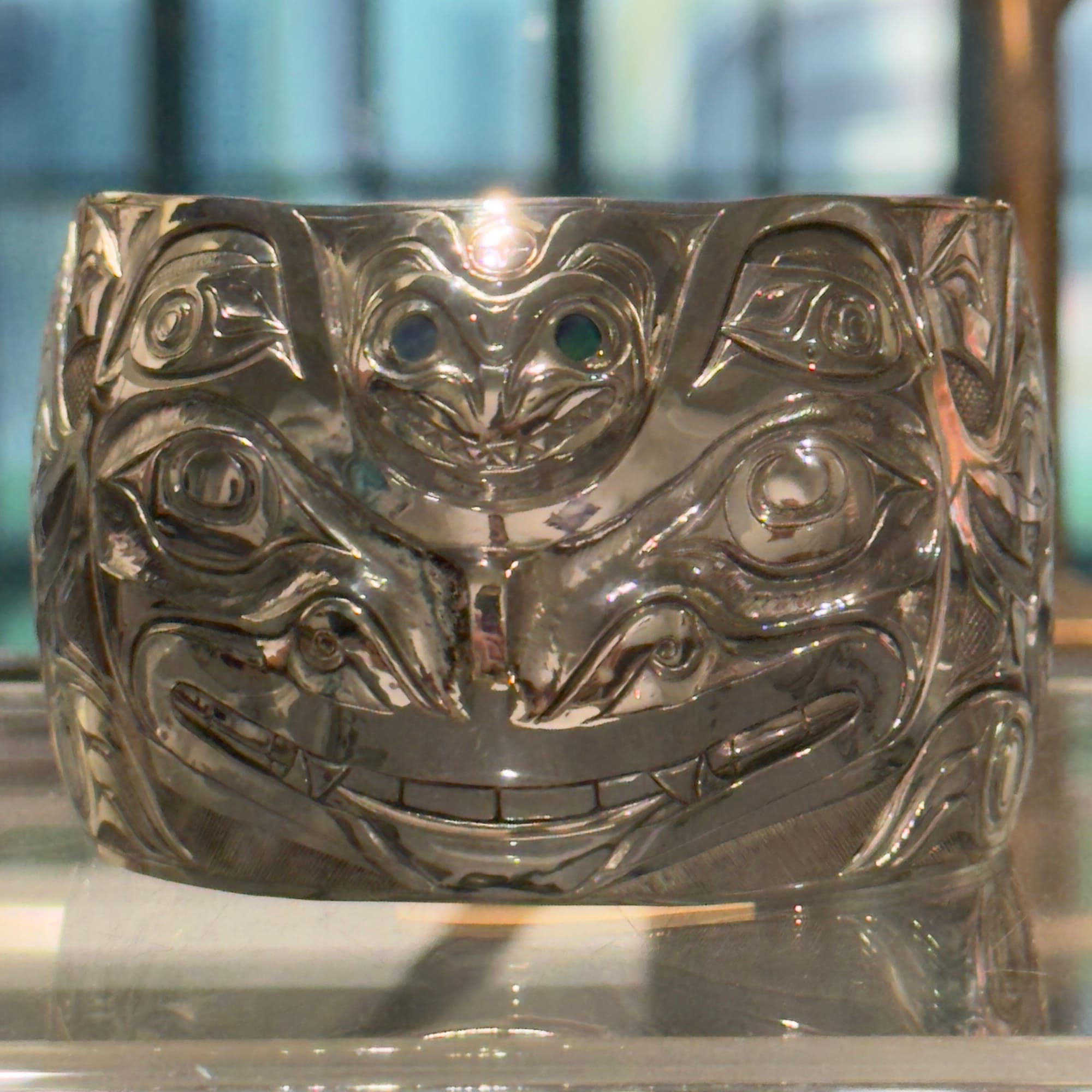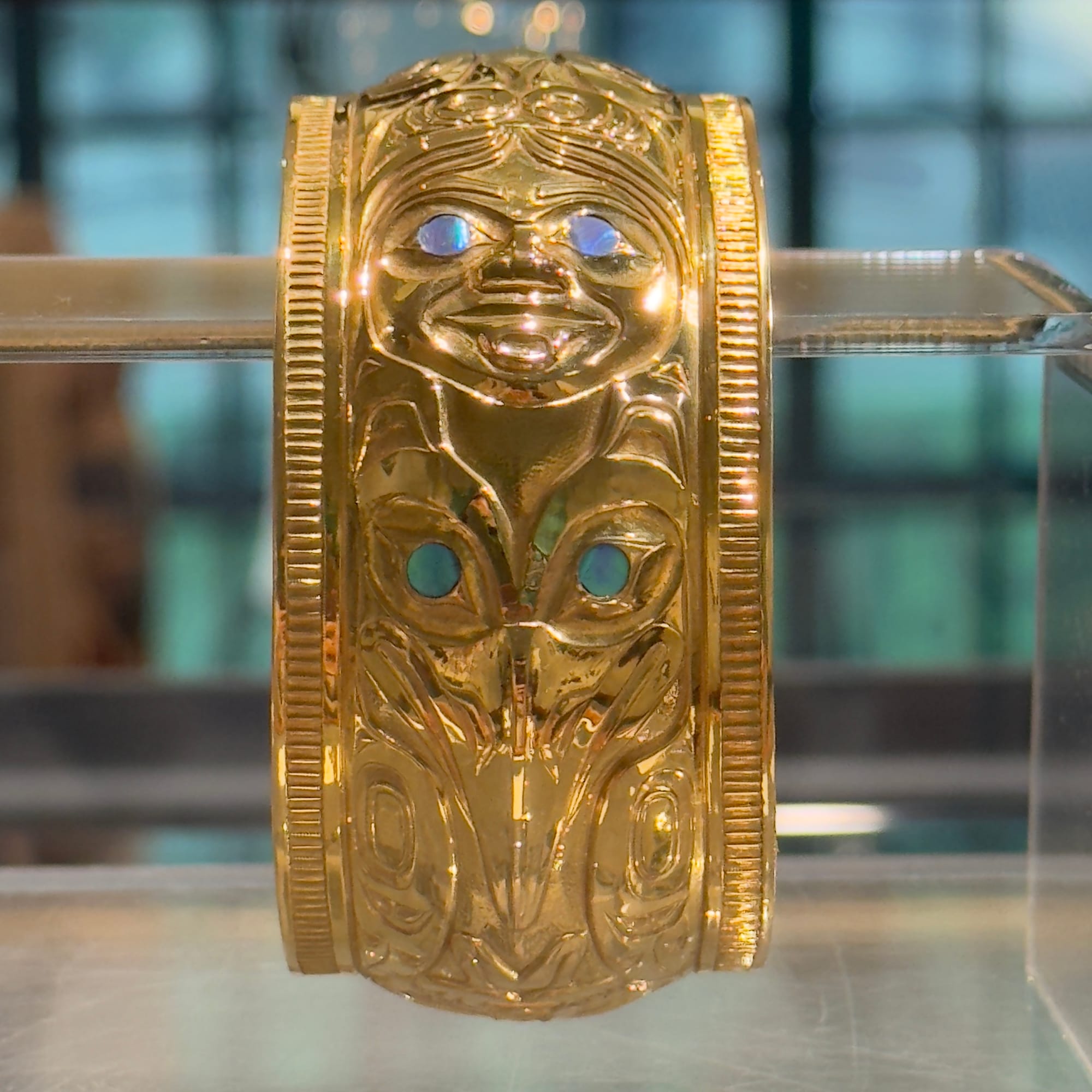 Another stunning work, a gold bracelet depicting Kalga Jaad, the Ice Woman who led the Haida people south to a warmer climate. Her blue eyes are comprised of abalone shell inlay over the gold repoussé. This Haida myth memorializes the migration during the Ice Age and holds special significance to Brillon's family and lineage. He created this bracelet for his sister to wear during her marriage ceremony to Kwakawaka'wakw Chief Kwamxalagalis Andy Everson.