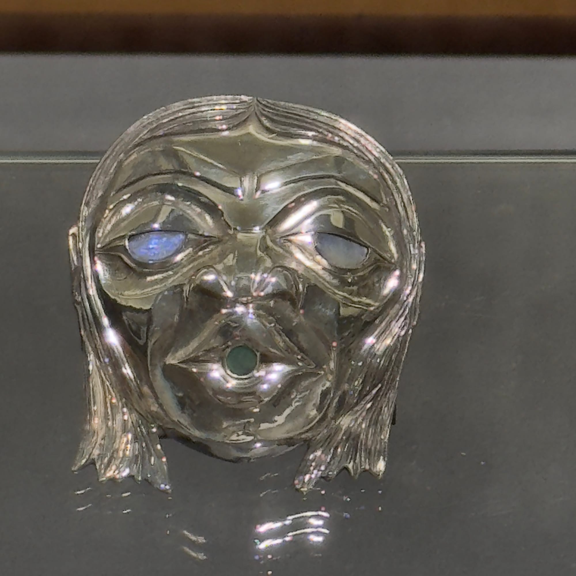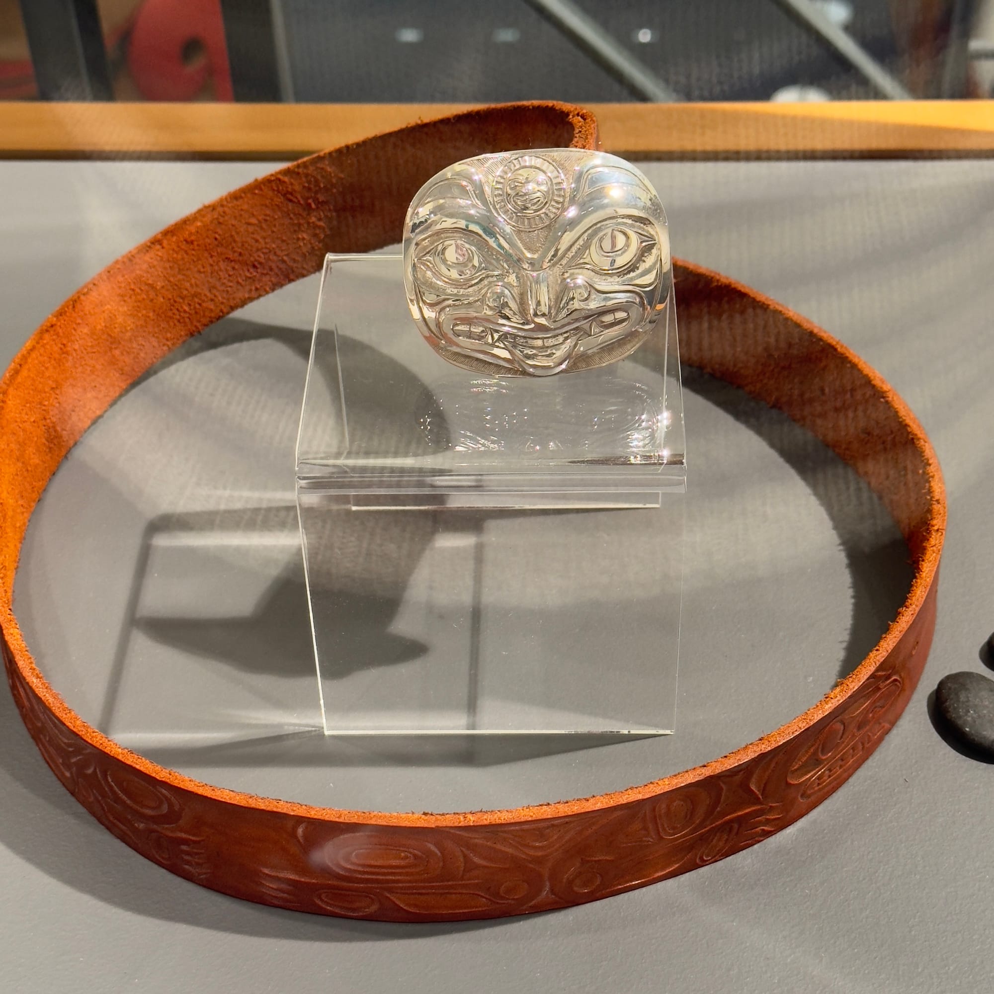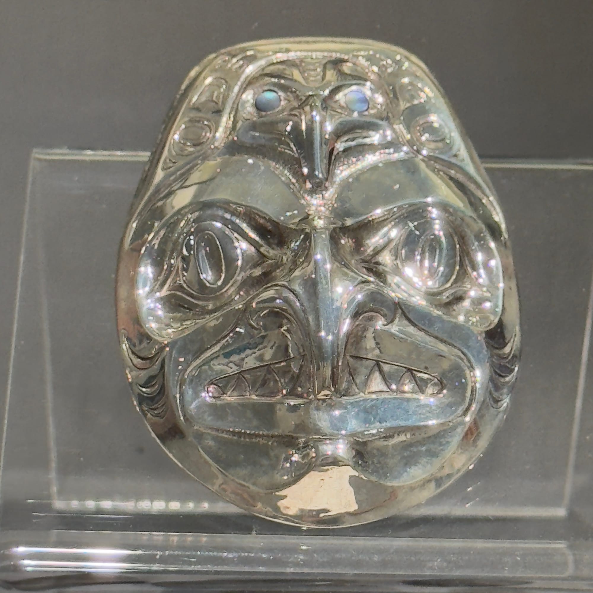 Another stunning work, a gold bracelet depicting Kalga Jaad, the Ice Woman who led the Haida people south to a warmer climate. Her blue eyes are comprised of abalone shell inlay over the gold repoussé. This Haida myth memorializes the migration during the Ice Age and holds special significance to Brillon's family and lineage. He created this bracelet for his sister to wear during her marriage ceremony to Kwakawaka'wakw Chief Kwamxalagalis Andy Everson.