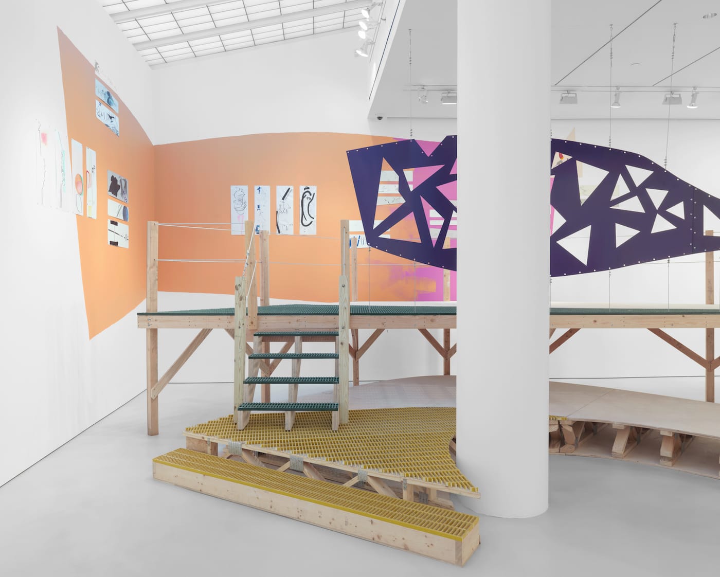 Towards the back of the gallery and extending out of the corner, with its lower platform or walkway curling around a column, while an upper platform (furnished with a guard rail) stays closer to the wall, “The Guests All Crowded Into the Dining Room” (2016) looks like something you might see in a backyard or a school gym or small town fair. The viewer must ascend the stairs to view the unframed drawings Stockholder has affixed high on the gallery wall, which she has painted orange and magenta. Even this large piece is contingent, connected to the wall by virtue of its function as a viewing platform for the drawings, which are arranged in sets, like something you might see in a school science fair.
