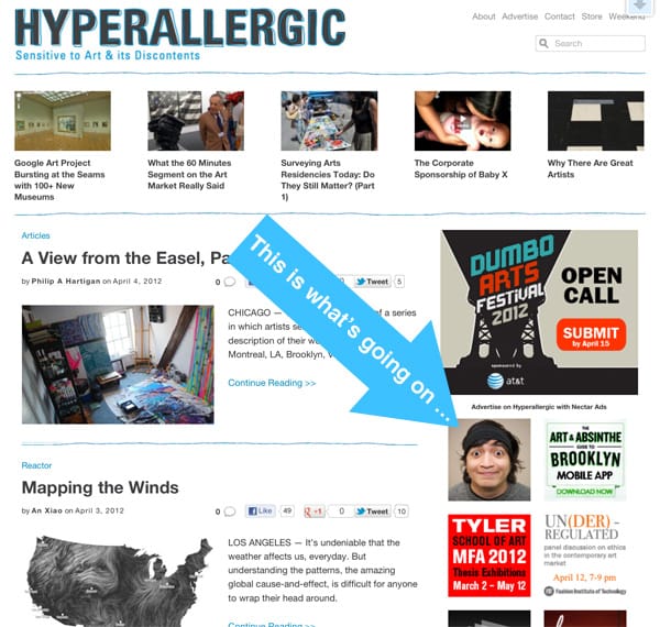 Last week, Hyperallergic publisher Veken Gueyikian received an email from someone who asked to purchase an ad square on Nectar Ads, the online ad network Hyperallergic uses. The request seems simple enough and within a few emails the transaction was made and we received the “ad,” which turned out to be an art project by artist Jesus Benavente. When you clicked on the image — which many of you may have already discovered — it leads to a webpage, www.ohheywhatsgoingon.com, that — I later learned — is simply the title of the piece, “Oh Hey. Whats Going On?” (2012).