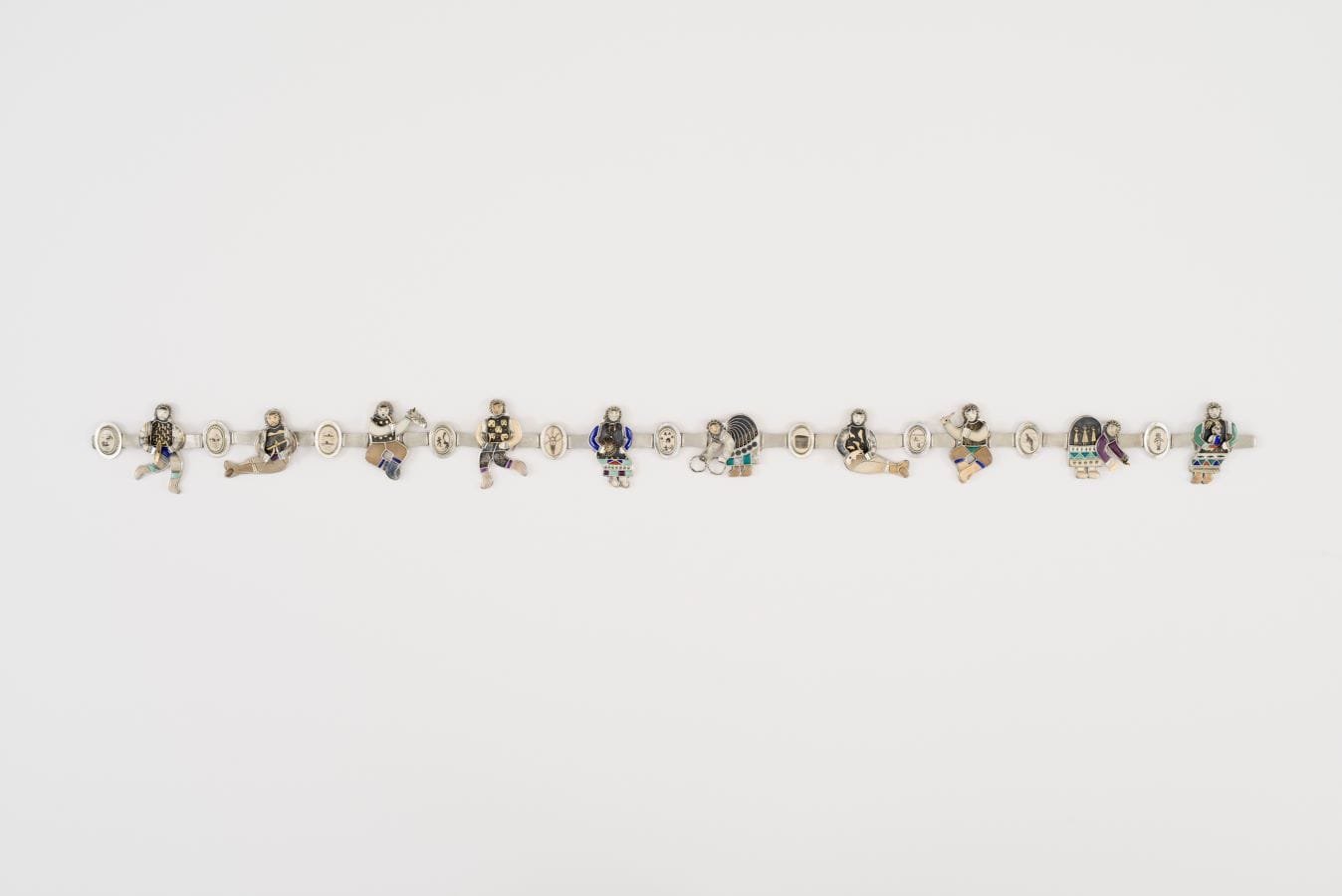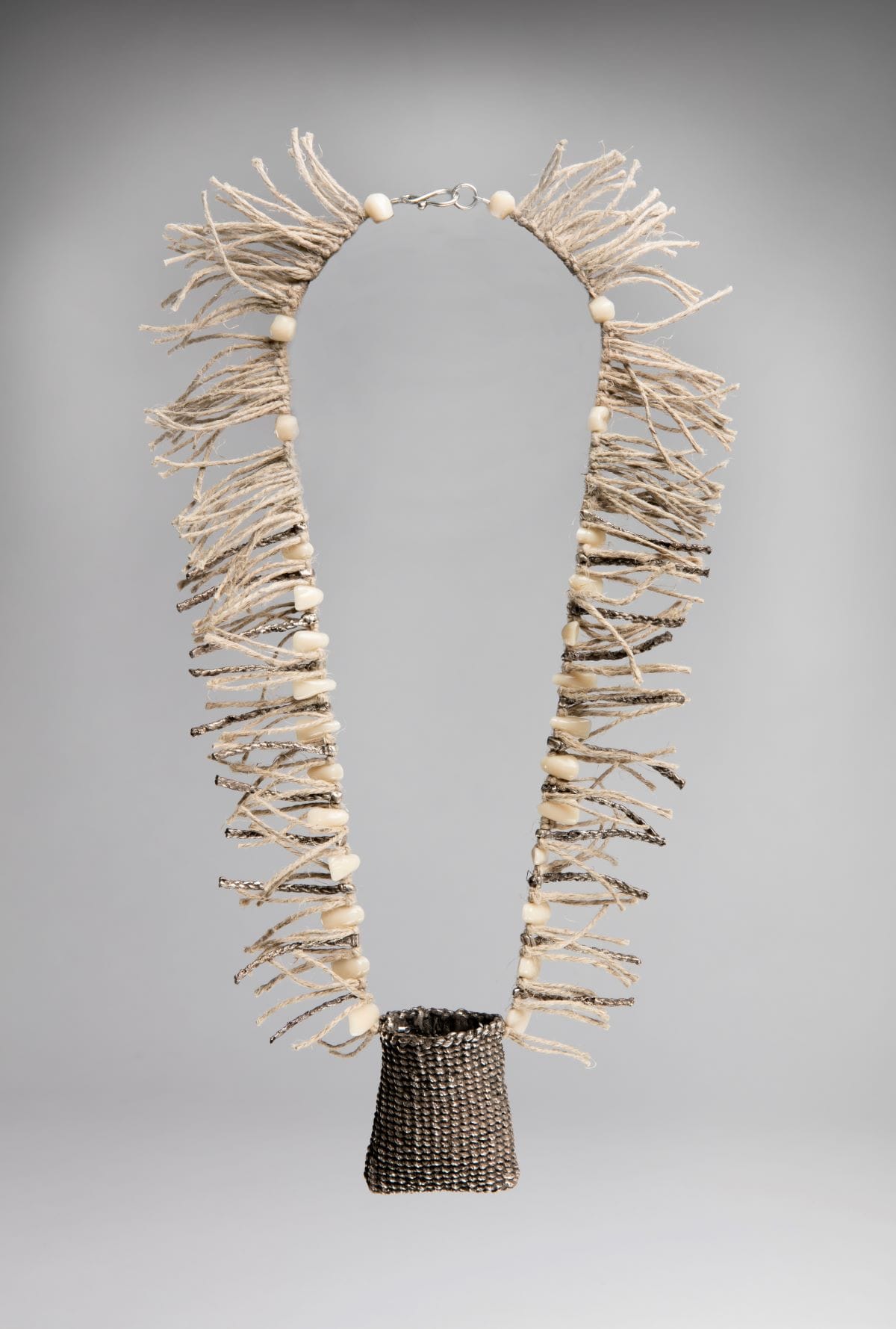 For example, “Tooth & Twine Necklace” (2016), a work by Carly Feddersen (Confederated Tribes of the Colville Reservation), started as an actual basket that Feddersen wove and then cast to create the silver pendant, the focal point of the necklace along with bits of twine and cast silver pieces that look like twine. “There are also fake teeth, referencing the traditional way you process the fibers by biting them with your front teeth,” Fleetwood said. “It’s a piece that addresses making pretty directly.”