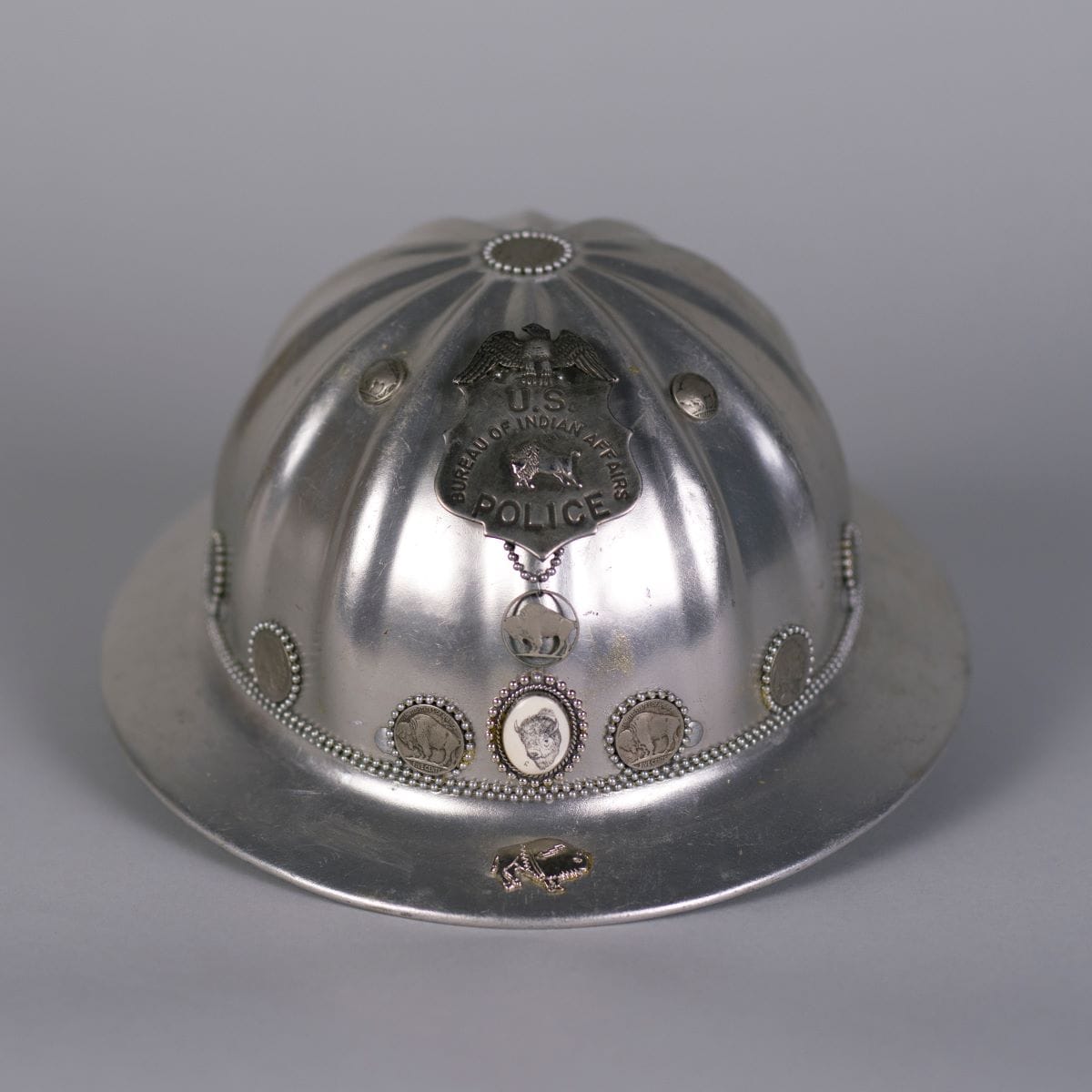 Unknown stories are given voice through works in the exhibition, like in the aluminum helmet by Richard Glazer Danay (Mohawk). It looks like a hardhat made from silver and features little buffalo nickels and a Bureau of Indian Affairs badge. “Mohawk ironworkers are considered by many to be the best in the world,” Fleetwood said. “Most of the major cityscapes and skylines in the United States, especially on the east coast, have been built by those Indigenous iron workers. This piece is talking about the relationship between Native people and that trade which is a little-known story.” Not many who look out at the skyline of New York see Indigenous craftsmanship, but they should.