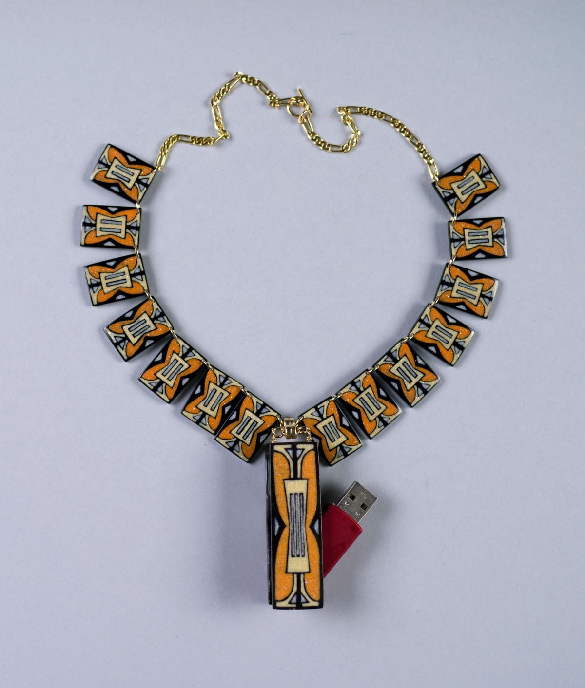 The Stories We Carry showcases jewelry that speaks to big issues the Indigenous community faces, like in “Decimation by Decimal” by Jodi Webster (Ho-Chunk/Prarie Band Potawatomi). “This piece is about the complicated relationship Native people have with blood,” Fleetwood explained. “There are very few nations on Earth where citizenship is determined by your blood purity, and what that means to Native people is complicated based on individual histories."