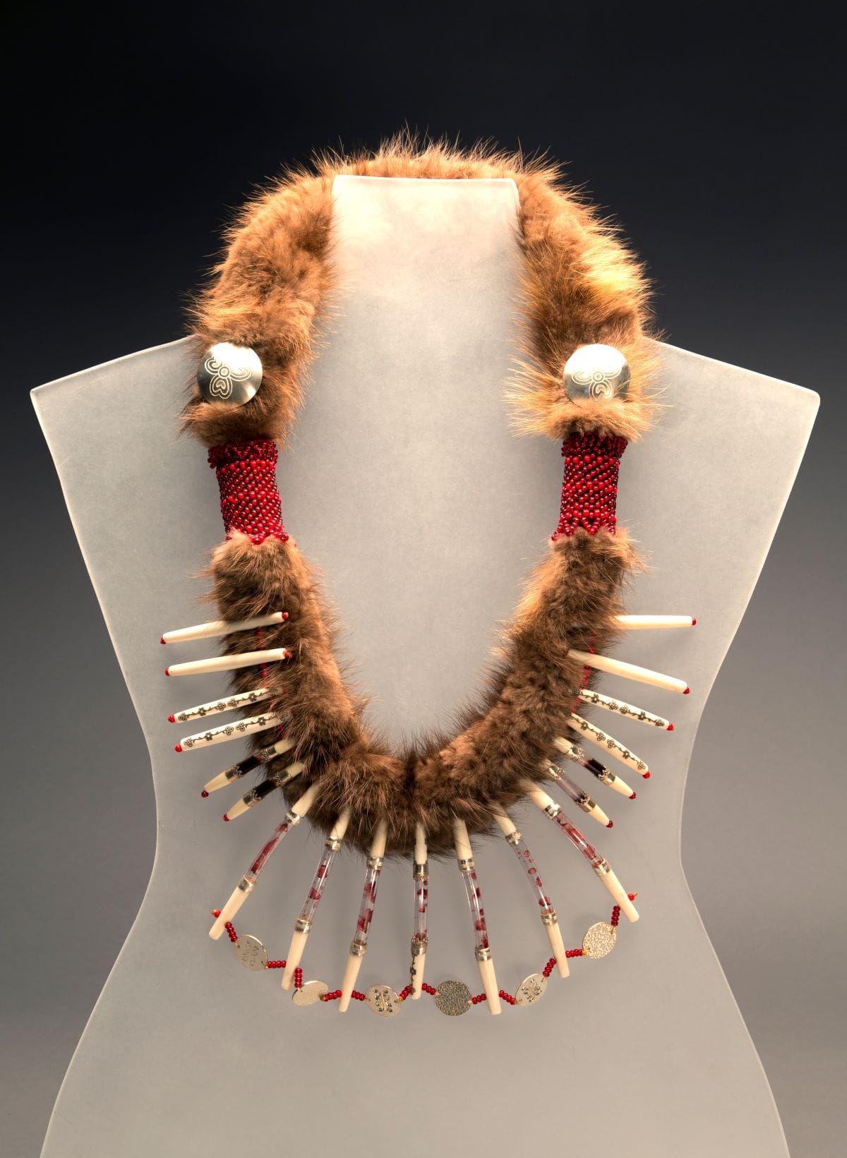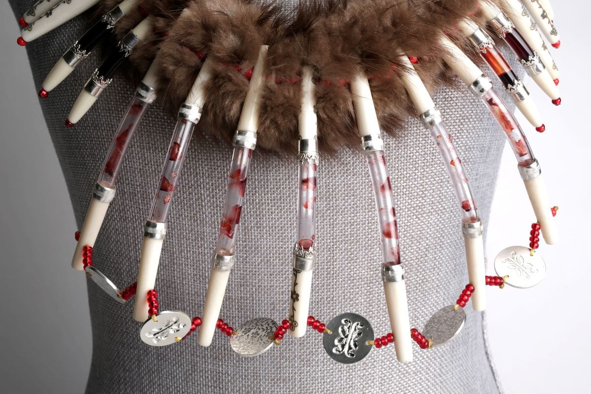 The piece is a brown, furry necklace featuring carved beads and translucent, quill-like pendants that hold droplets of fake blood. Gazing at the piece, I think about how wild it is that something so small, like a bead of blood, can have such massive consequences for the people whose veins it flows through. “It’s a really powerful exploration of something that is uniquely North American Native,” says Fleetwood.